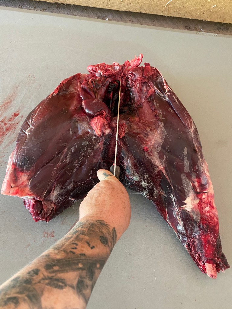 Leg roasts are the largest cuts I make on an ungulate, and it’s a great cut if you can split the pelvis well. I often use the edge of a table as leverage to separate bit bones. It saves on the knife sharpening, my hands, and take apart time. Some people like to carve it up for all the nice little stakes you can get out of those big muscles, and hey, stakes are good, easy to cook, and approachable for those who don’t want a lot of meat at once, so go to it if it’s your thing. Really, if you’re the one cutting it up- do it your way. I like big roasts and less cutting, it also makes wrapping a breeze. I wrap all my cuts in plastic cellophane to keep the freezer burn out, and cover in lined butcher paper for long lasting freshness. Bone in cuts should be eaten within a year, but if you take the bones out and wrap well, frozen meat will stay good for many years. We tend to eat ours in a timely way, but still wrap everything to last.