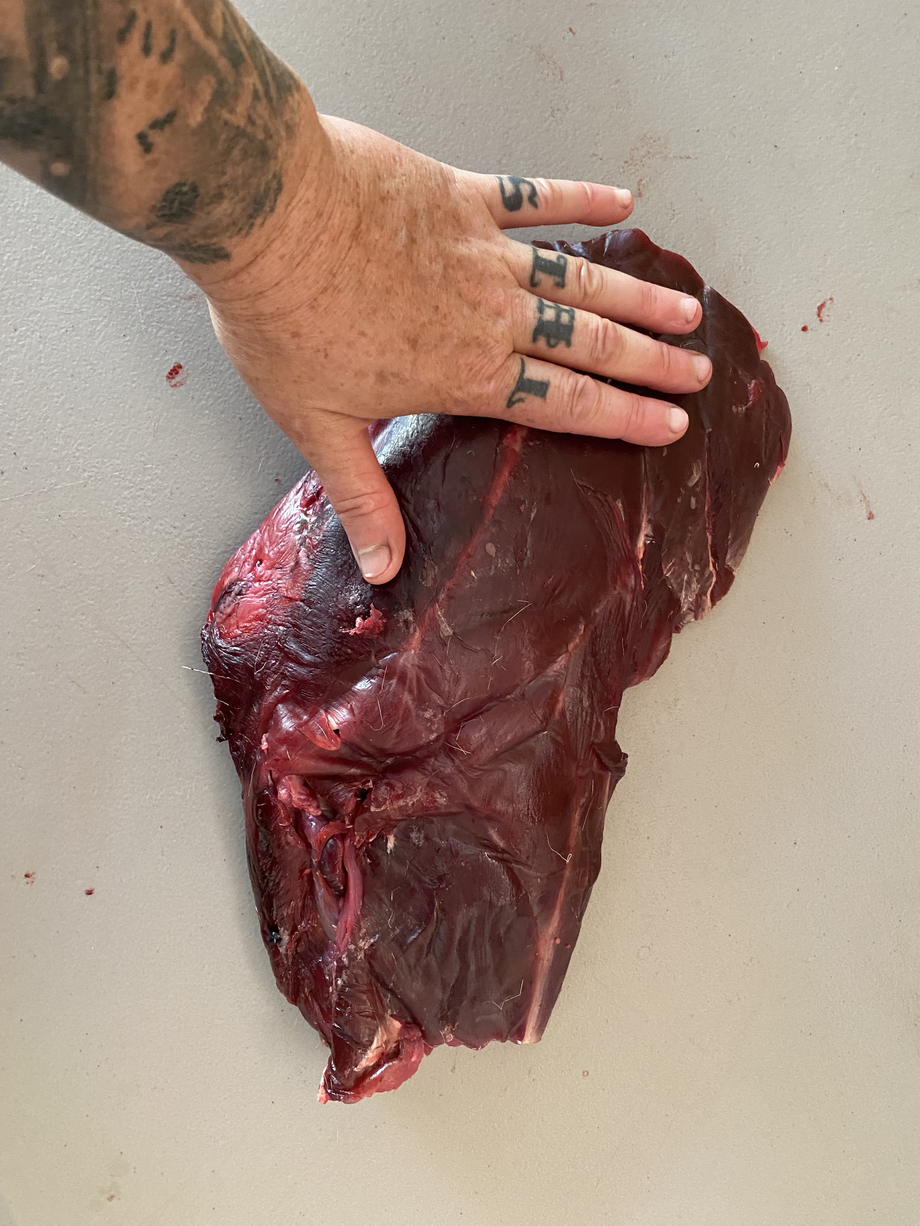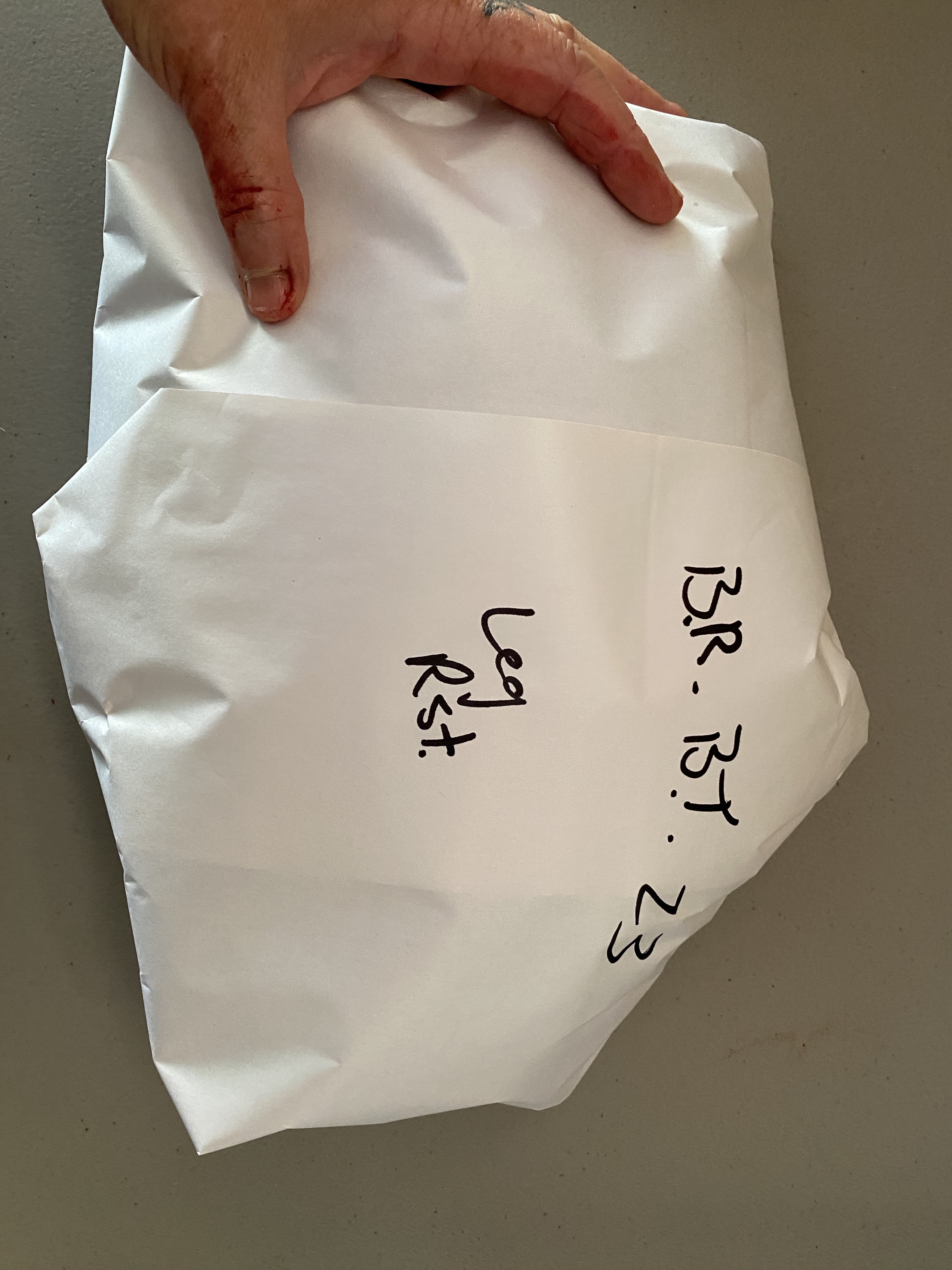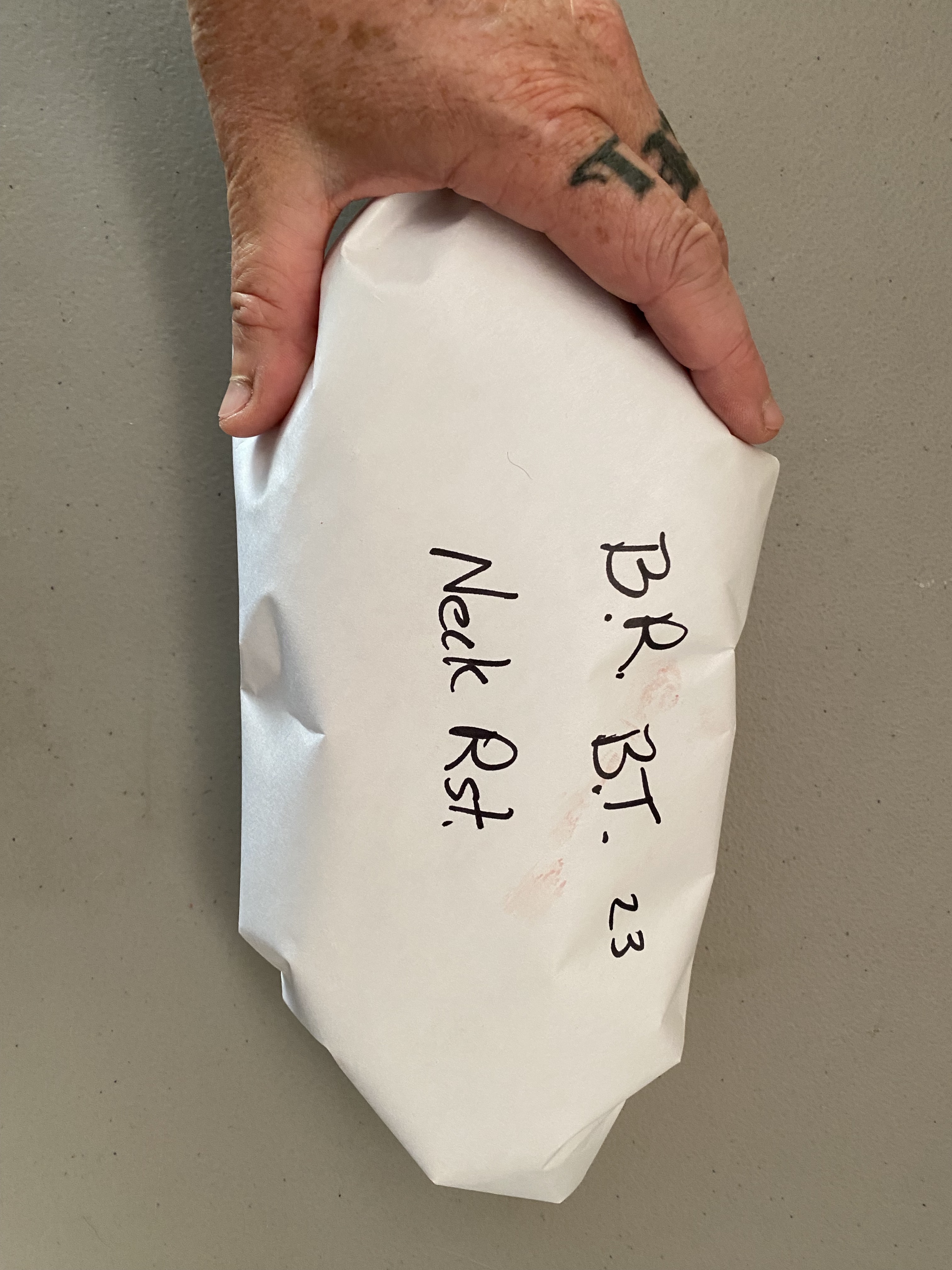 Labeling your cuts to keep a single animal together and to know what’s in each wrap helps when you’re stacking a lot of different things in your freezer. B.R. B.T. 23 means Big Rock, Black Tail 2023. I know where I salvaged this animal (big rock rd.), what species (black tail deer), and what year. Some people put months down too. When I label with Rst. (roast) that means bone in. If I leave the bone out- I say so on the wrapping. Any cuts not a roast are labeled with part names, like back-strap or grinds. Grinds go in a zip-lock to freeze. I’ll grind all my meat at once later this fall, after slaughtering season is over and all the need to grind meat it bagged and frozen. Freezing meat breaks it down a little more, making it easier to feed through a grinder once defrosted again. Pro-tip: cut grinds up well, ,or clog the grinder with sinew and enjoy the headache of constantly taking your grinder apart to fix the blockage.