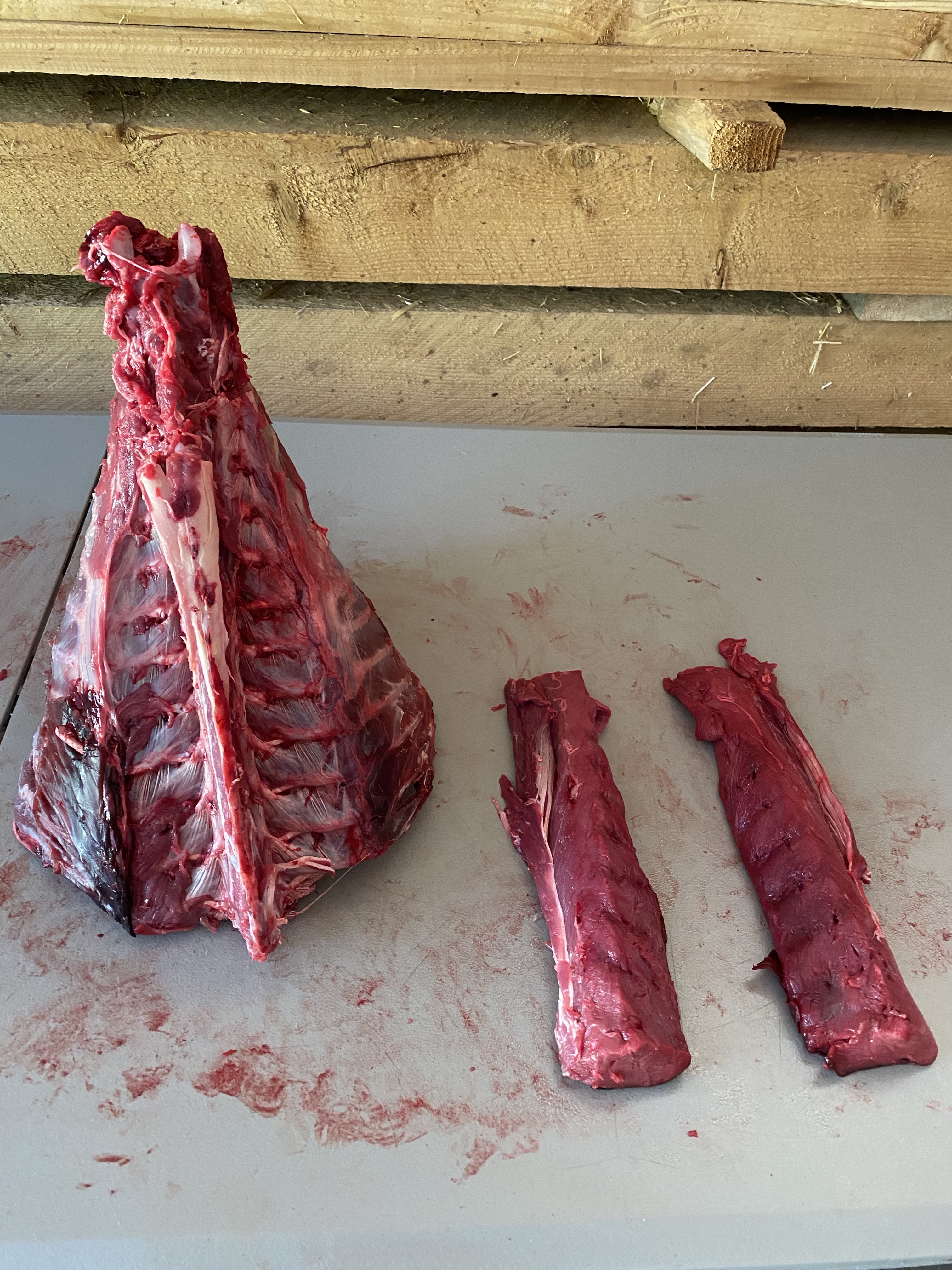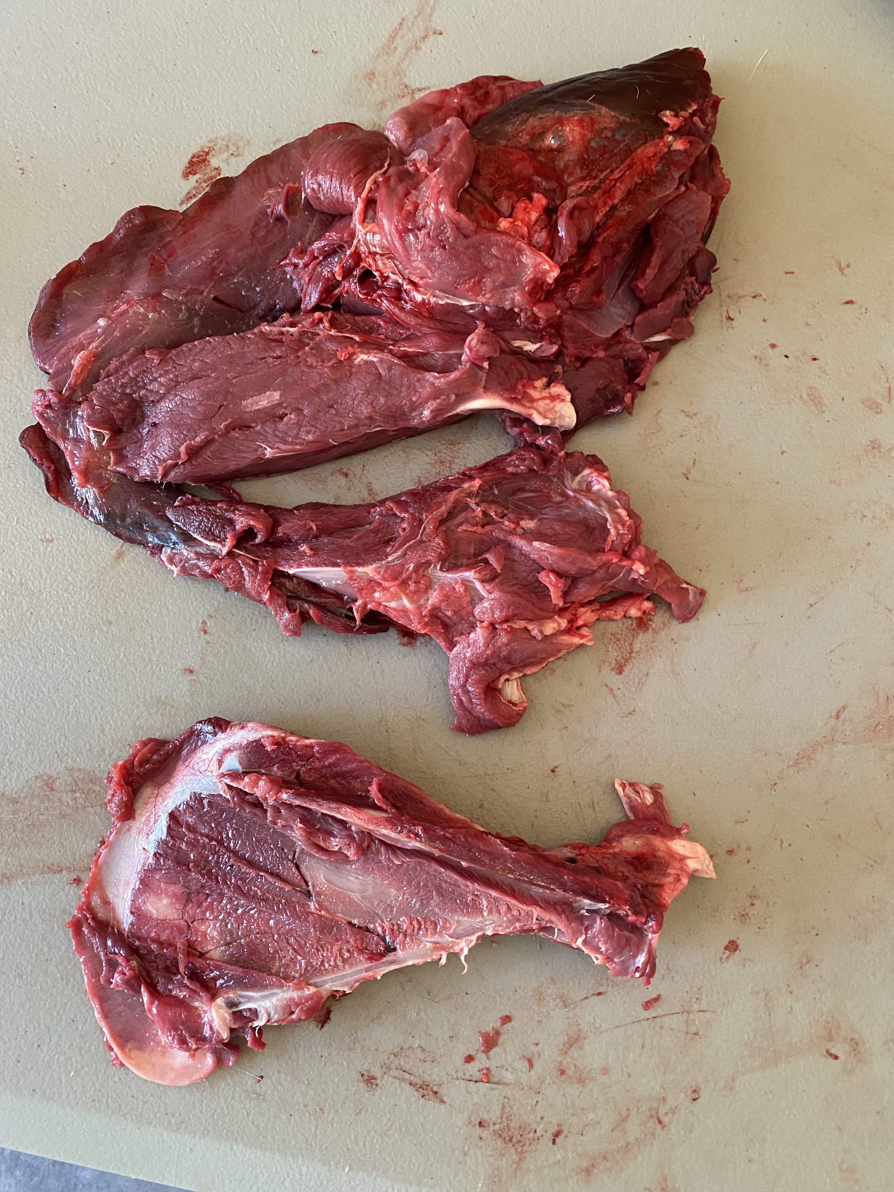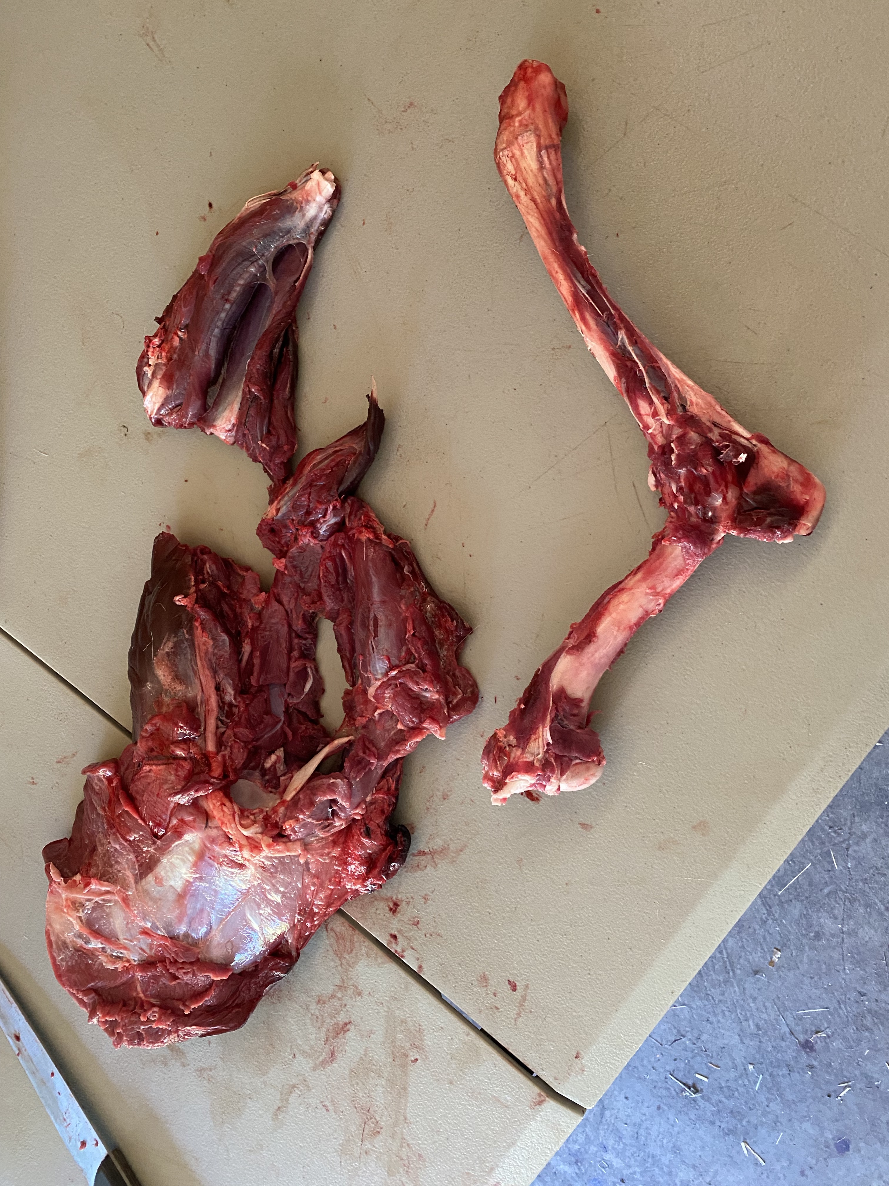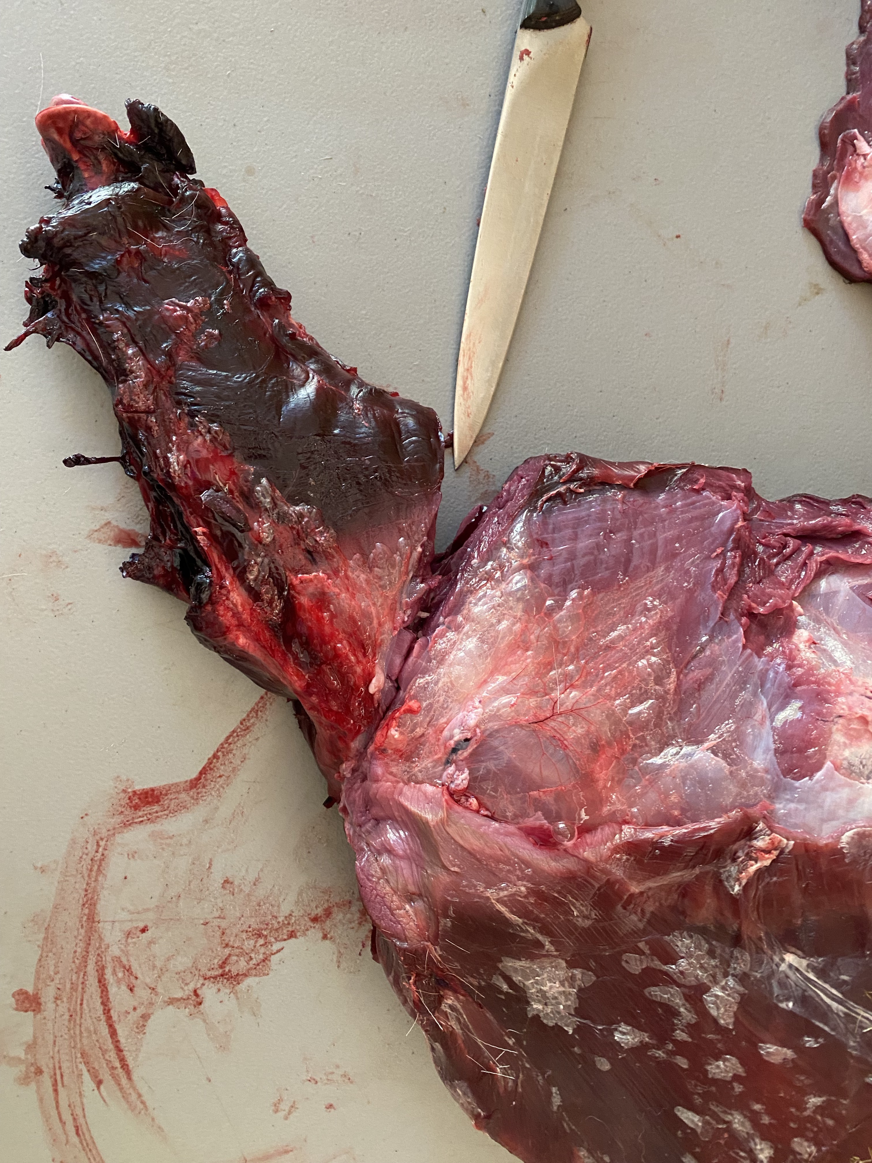 The loin roast I cut her (with hand above), had the best cuts and a cute little heart shape in the bone. Back-strap and loin cuts are dreamy, and putting them together in one single package makes for a great shared meal with friends and family, giving a real wow factor to the meal. We’ll still have some good back-strap on it;s own in another cut later in this breakdown. With most roasts I leave the big bones in for flavor, and also to save time in the tedious process of de-boning. You loose a lot of meat de-boning, and less cuts means less work and less chance for bacteria to get in. Separating the front legs from the ribs gives you two shoulders to work with, followed by neck removal. I usually leave neck together and use as a soup stock item. You can cut most of the neck meat from the bone if you want to save freezer space or avoid those complicated vertebra.