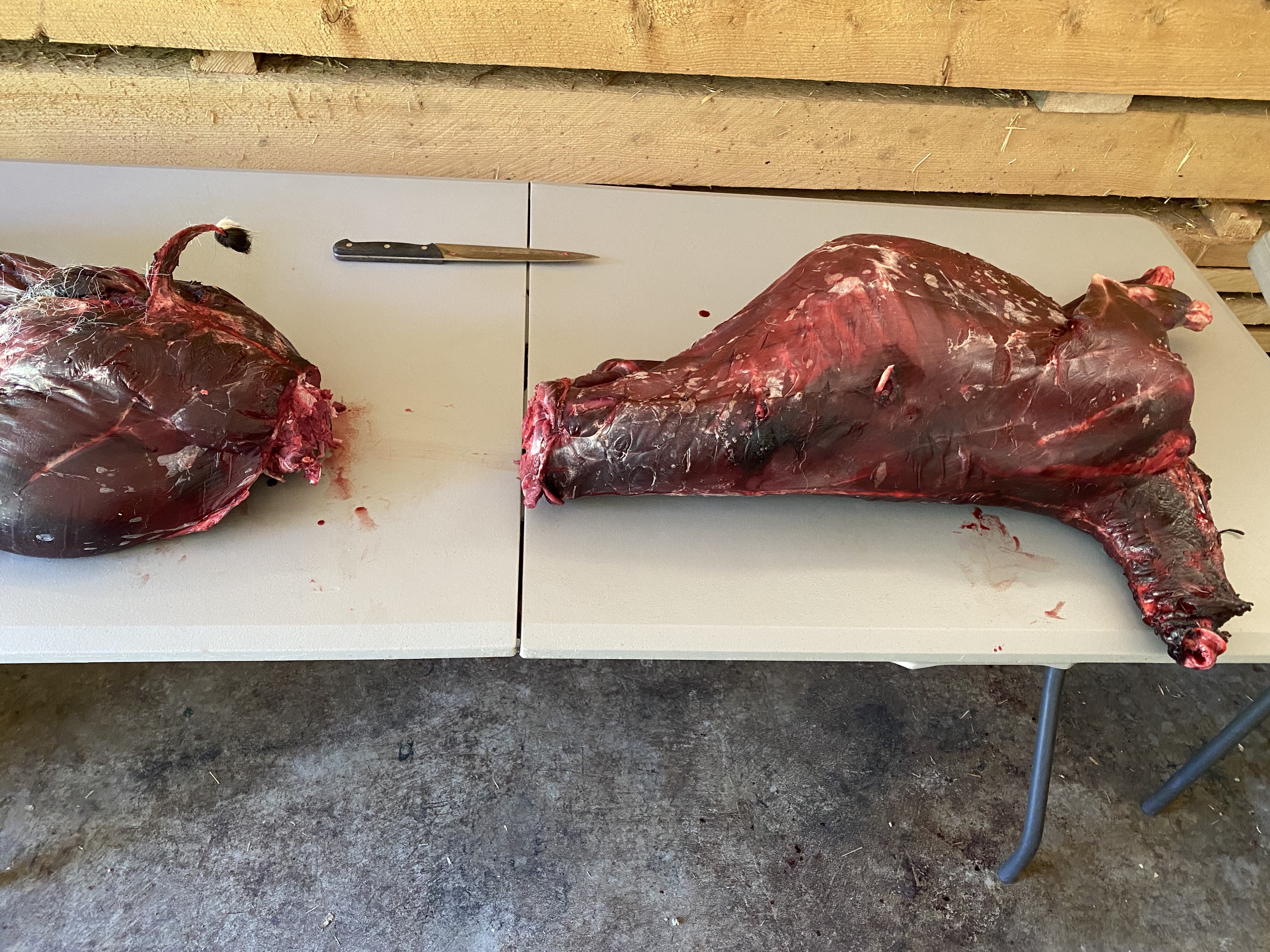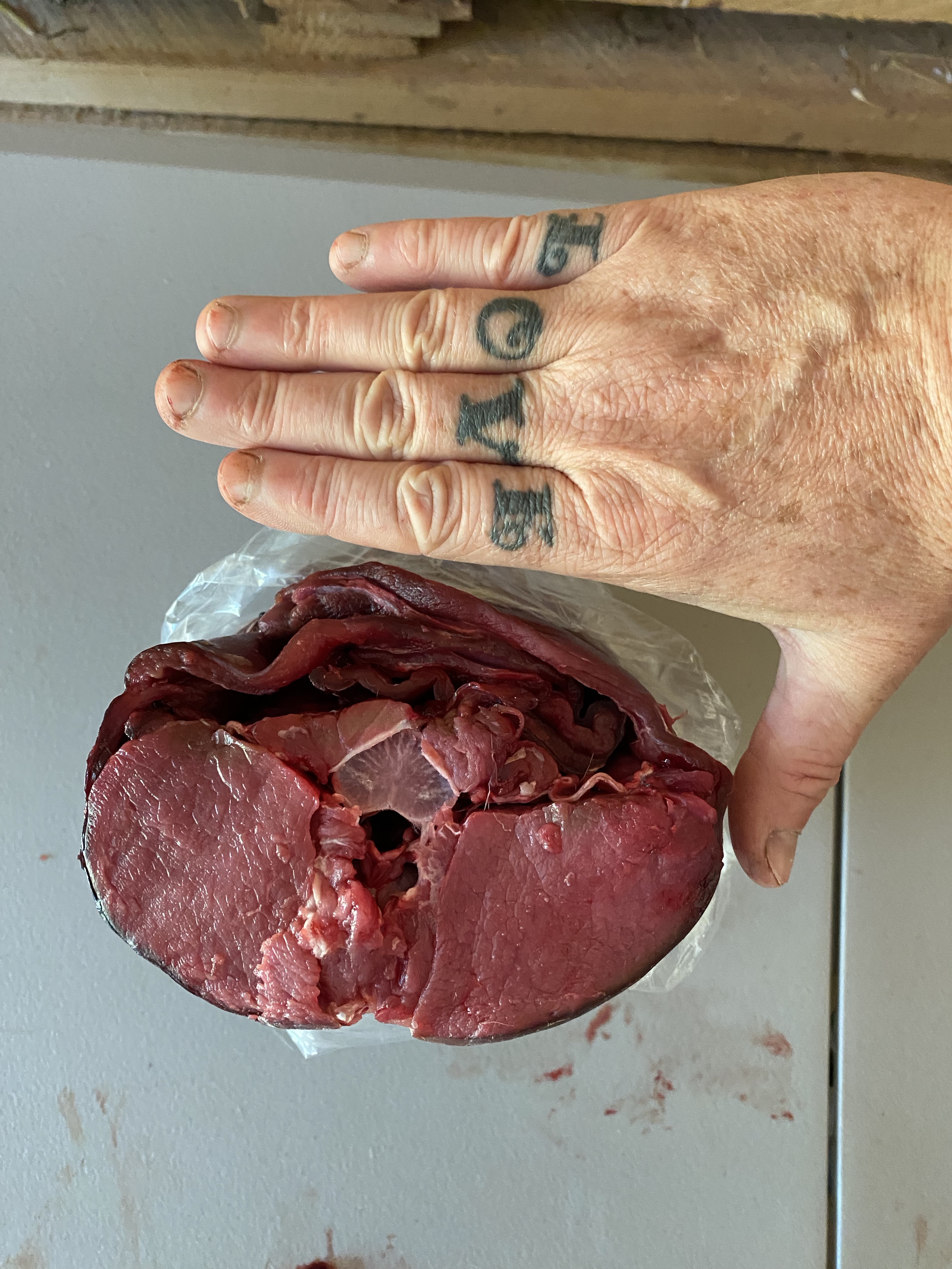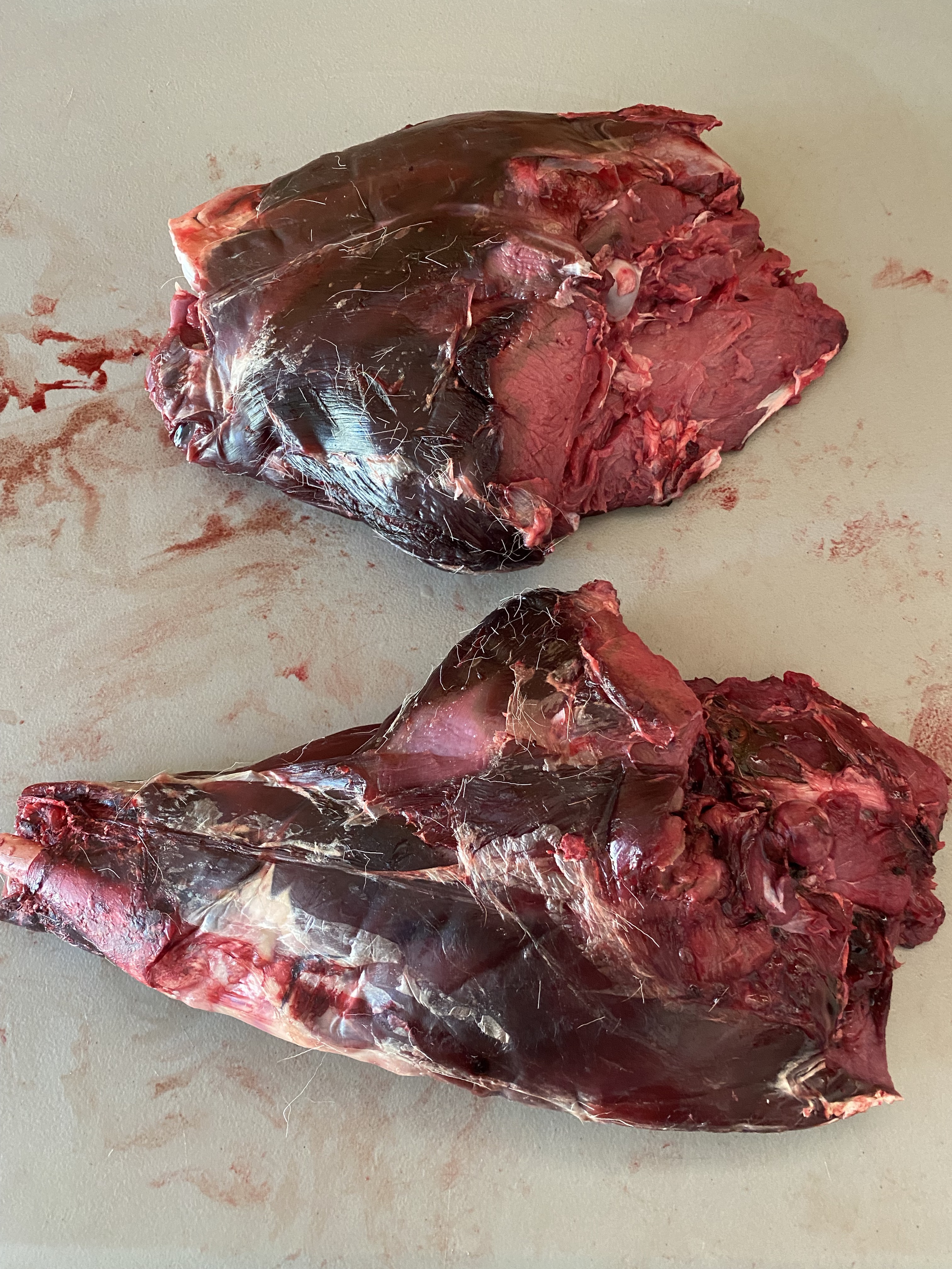 Leg roasts are the largest cuts I make on an ungulate, and it’s a great cut if you can split the pelvis well. I often use the edge of a table as leverage to separate bit bones. It saves on the knife sharpening, my hands, and take apart time. Some people like to carve it up for all the nice little stakes you can get out of those big muscles, and hey, stakes are good, easy to cook, and approachable for those who don’t want a lot of meat at once, so go to it if it’s your thing. Really, if you’re the one cutting it up- do it your way. I like big roasts and less cutting, it also makes wrapping a breeze. I wrap all my cuts in plastic cellophane to keep the freezer burn out, and cover in lined butcher paper for long lasting freshness. Bone in cuts should be eaten within a year, but if you take the bones out and wrap well, frozen meat will stay good for many years. We tend to eat ours in a timely way, but still wrap everything to last.