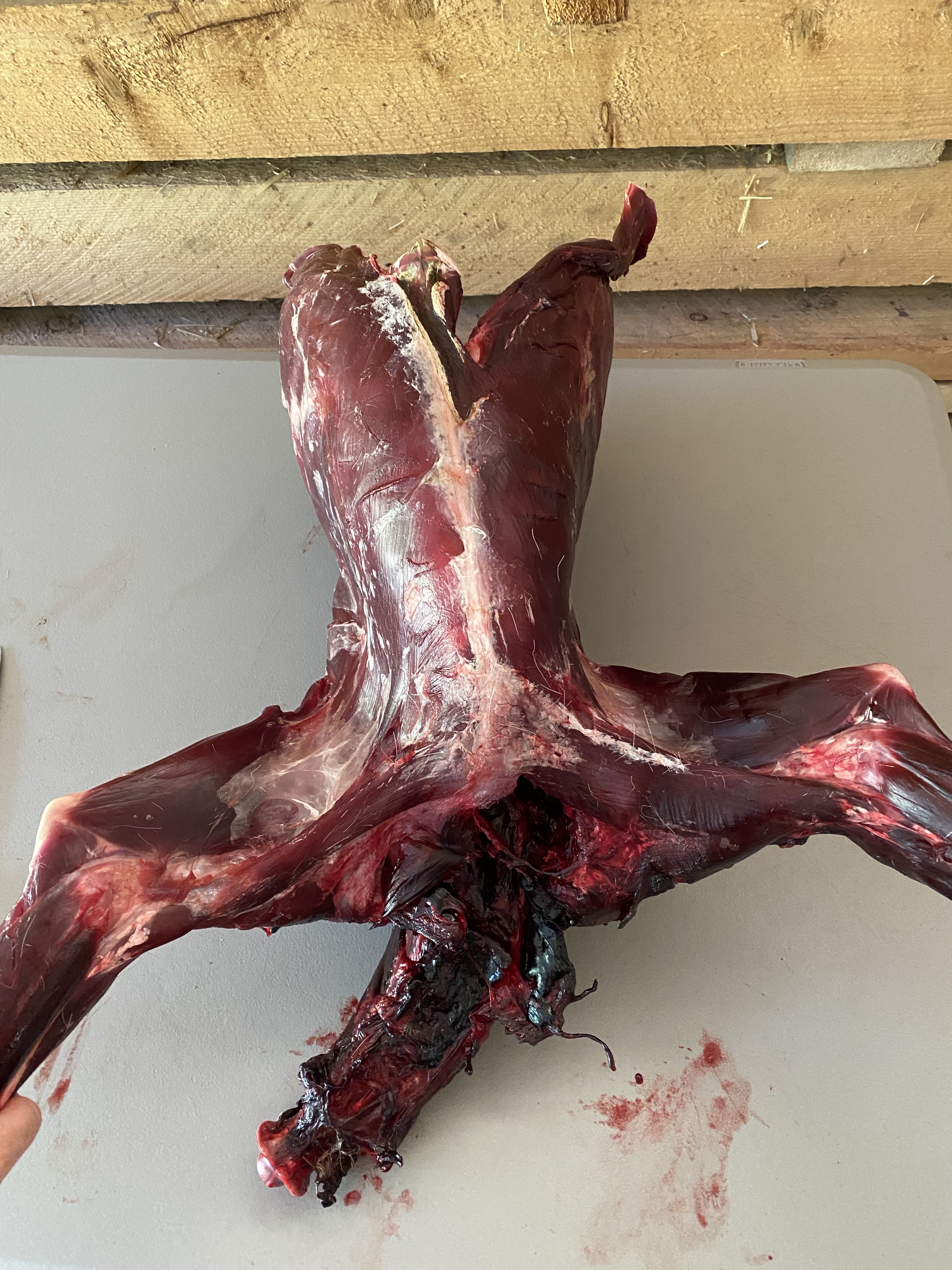 Rib cages are often a challenge, and though I love roasting a rack after I’m done butchering, this rib rack will go to the scavengers to reflect my gratitude for this abundance of wild food. I did scavenge more meat off the bones for our grinds bag- always good to put the trimmings in a bag to grind later for deer burgers. On my sheep, I take the time to carve off the brisket, but deer have little fat in that area, so it went to the woods to feed others. There was also some bruising in the ribs, with a few cracked from auto impact. Bone fragments can become a real danger in the meat; swallowing one can injure a person, so a lot of caution goes into cleaning a scavenged deer. As I began on the back half of the carcass, I found another major injury, which was the cause of the deer’s death. Her right side took full impact, breaking the right metatarsus, cracking several ribs on that side, bruising the lower back, and, as I cut into the pelvis, shattering the right hip entirely into fragments, which I only discovered once Ii began butchering the hind end- can you tell just by looking?