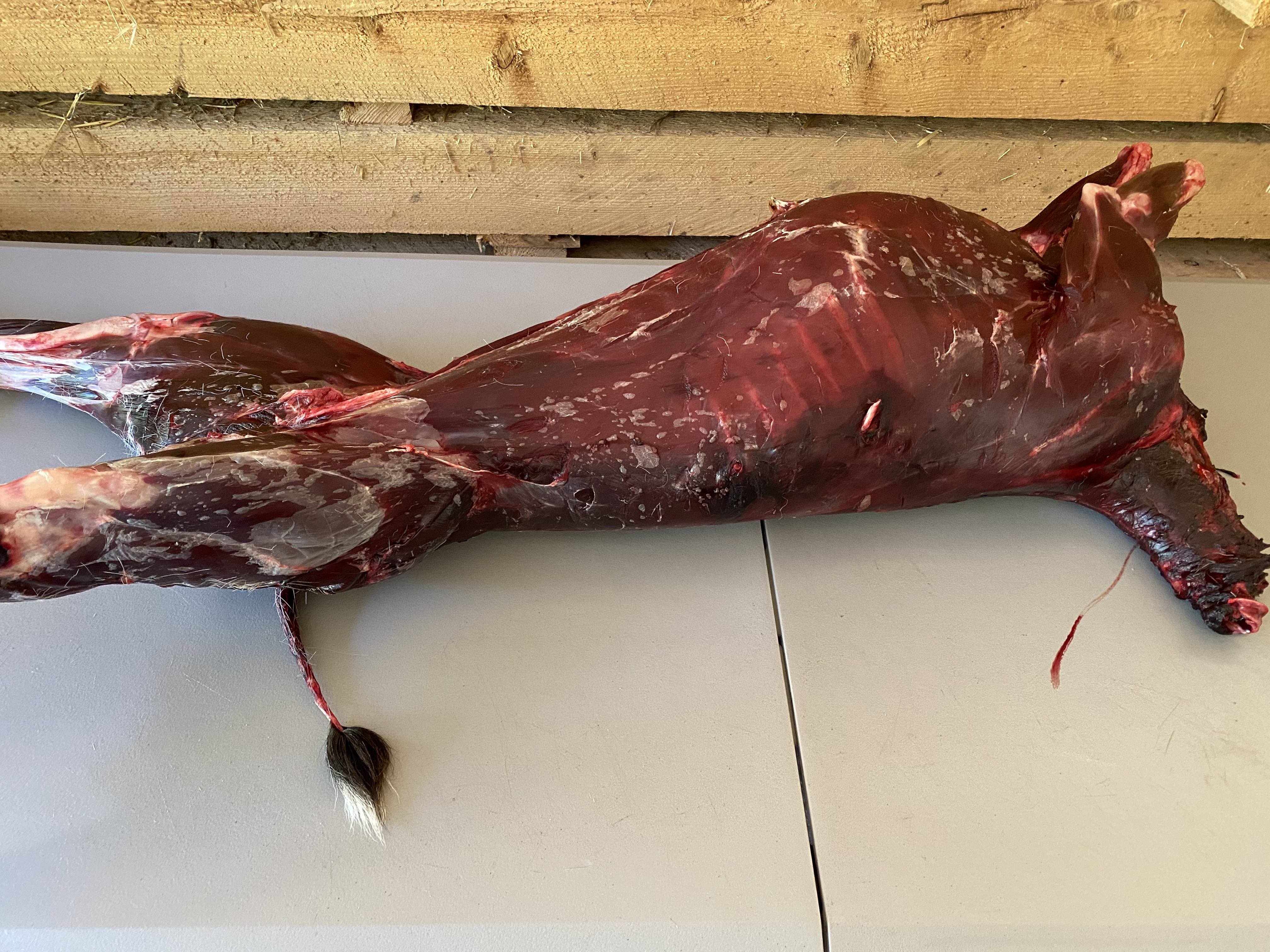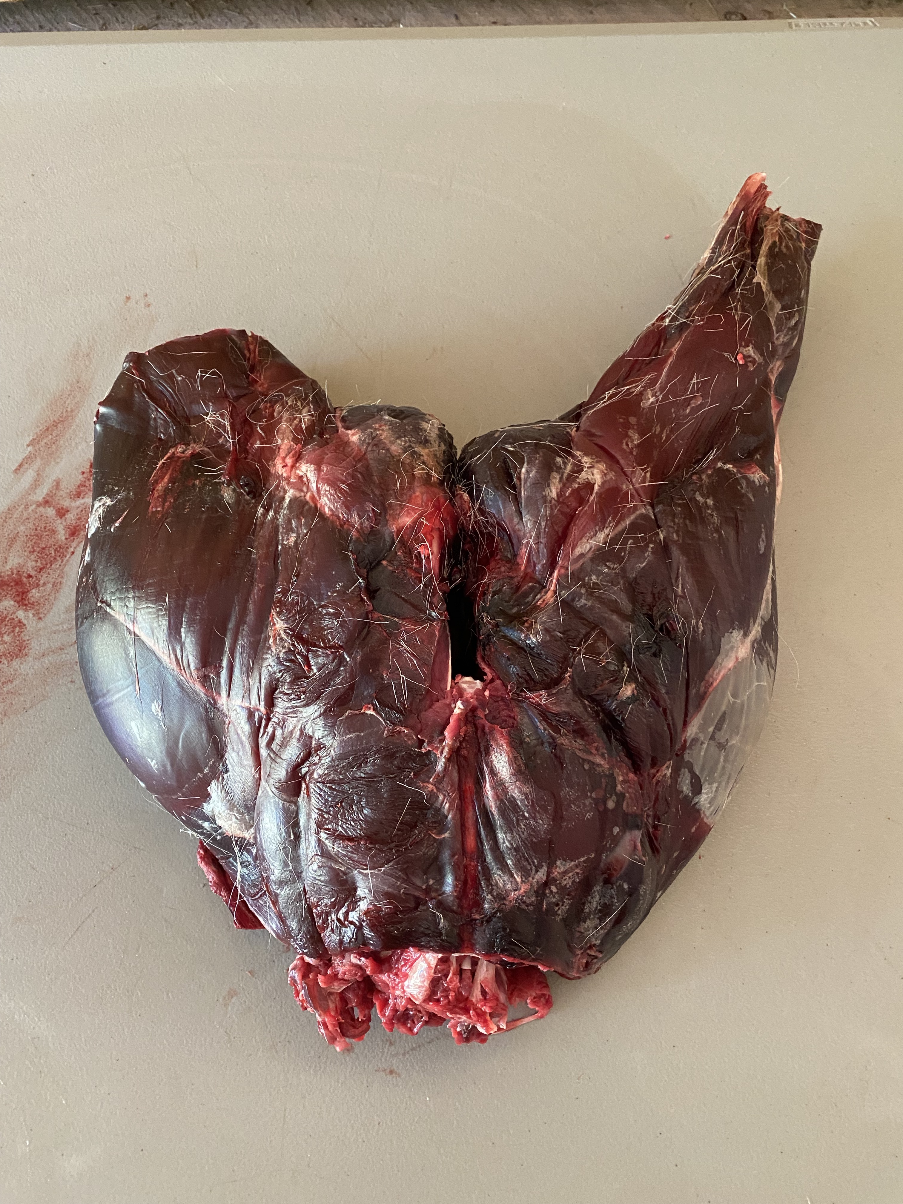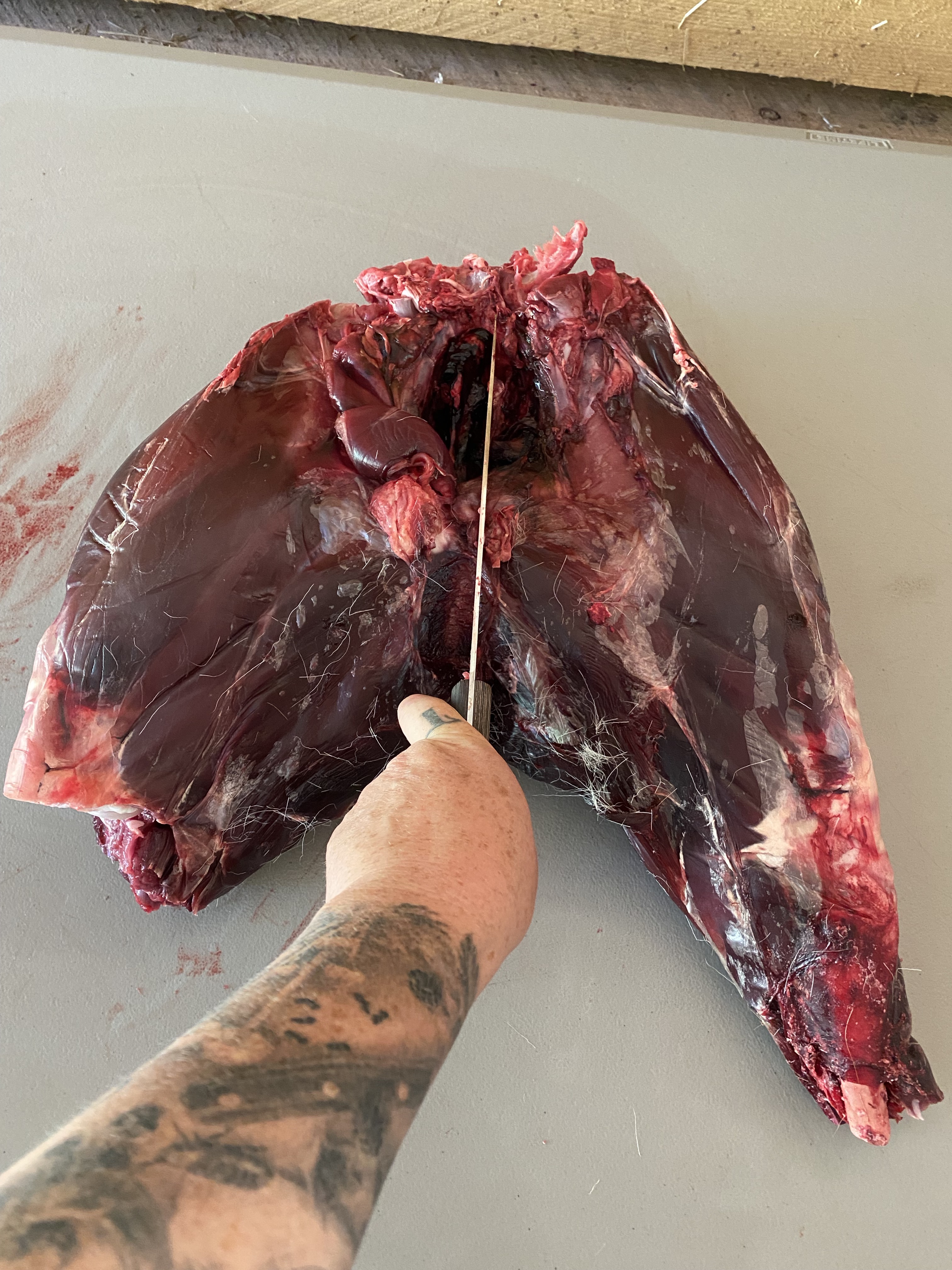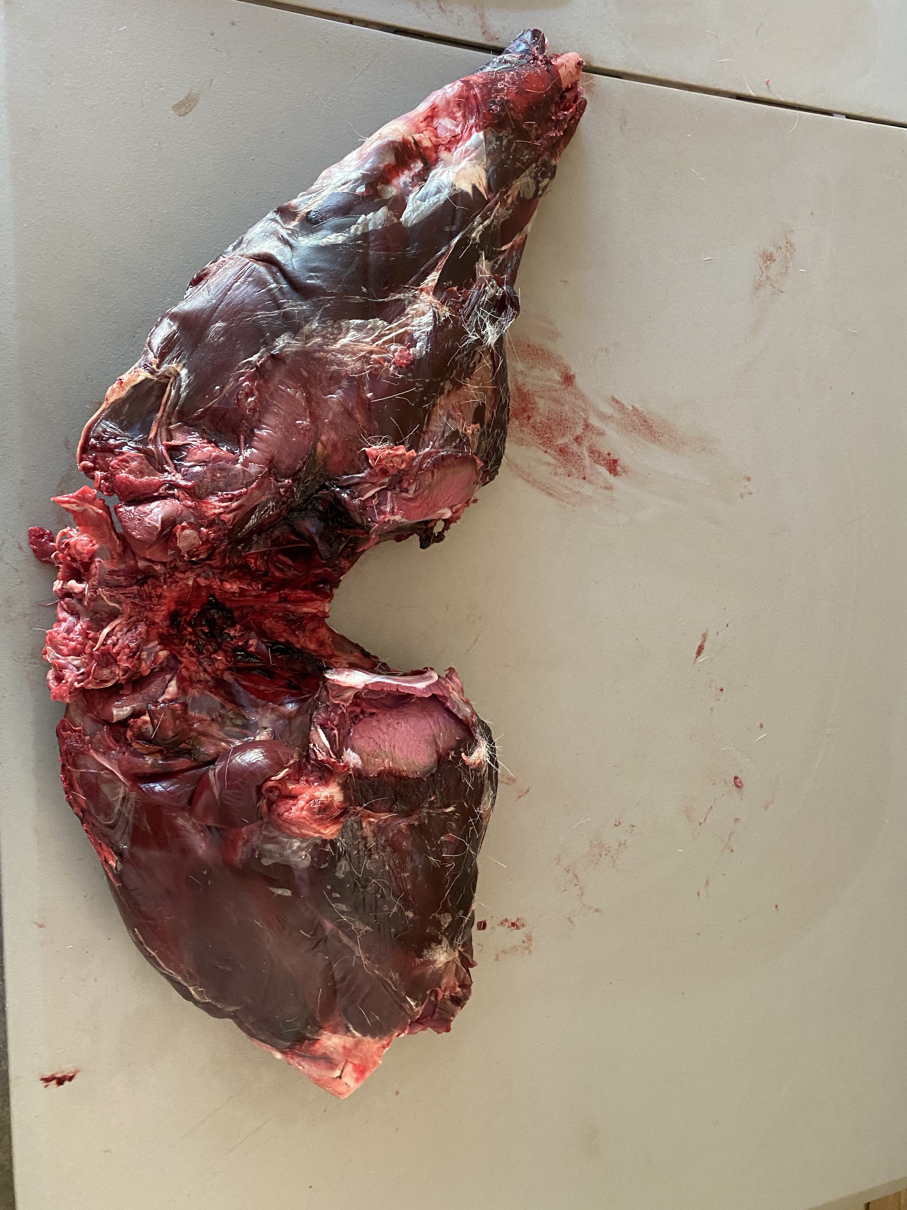 My partner called me on the way to work, early this morning, to tell me he’d seen a dead deer on the road near our house that looked intact. I promptly grabbed my truck and headed out to check the carcass. It was 54F outside- cool and dry, ideal “summer” conditions for road kill salvaging. Note- salvage tags are legal here in Washington- but you have to file them ASAP with WDFW. Not all state allow this activity, so know the laws where you live. Please also know the risk of salvaging meat and do not attempt without some experience, especially if it’s a warmer time. Bacteria can set in fast, and road kill usually involved some serious blunt force trauma to the animal, with a high probability the innards will rupture and spoil a lot of the meat. Not only was our deer fresh (still warm in the chest), on a cool morning, with a broken leg and some minor lower back bruising. The intestines looked intact and the carcass was not bloated at all, so I hoisted this amazing gift into the truck and got her hung in the garage for a full inspection.
