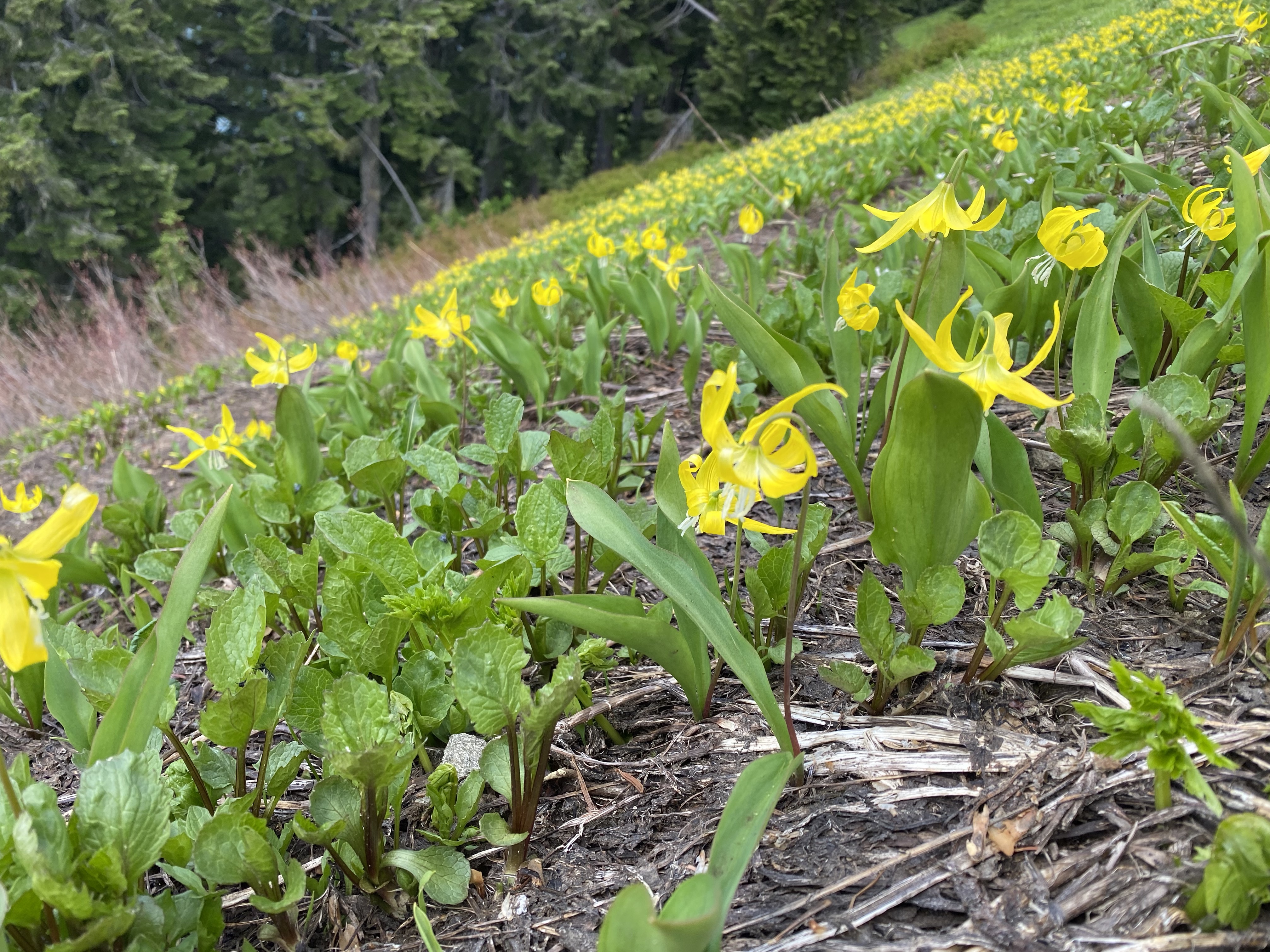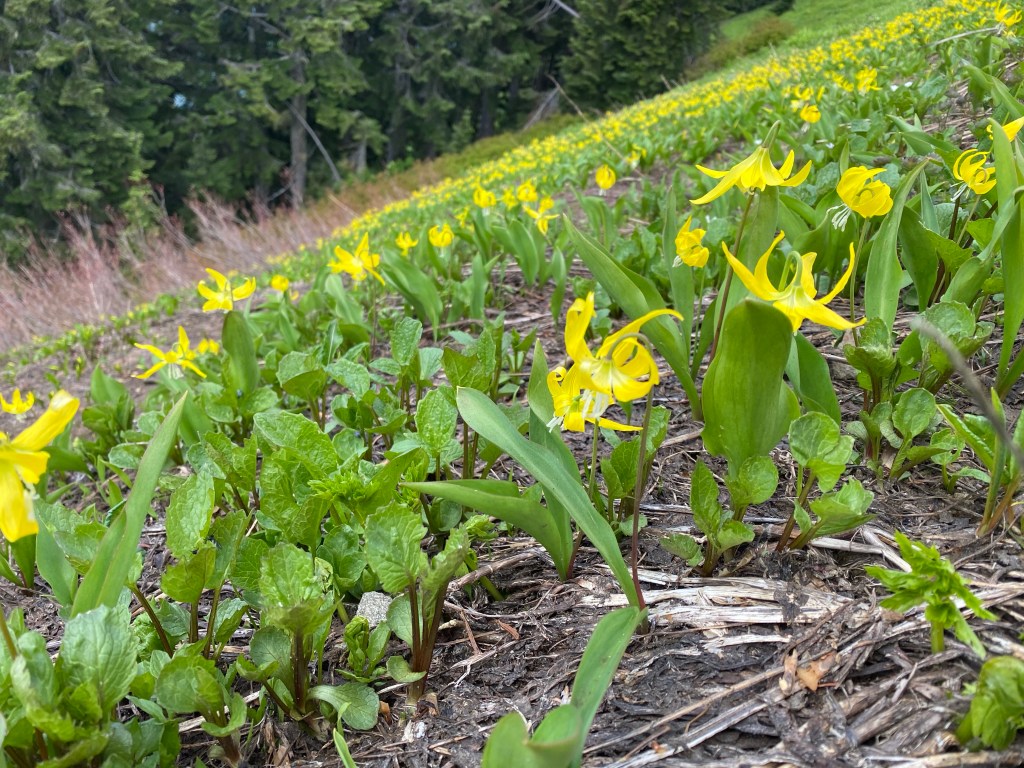 We traveled back in time to experience early Spring again with glacial lilies in a carpet of gold across alpine slopes. The Cascade peaks are calling, and panoramas abound as we ascend into the sky on Evergreen Mountain. These vistas were inaccessible for several years after a landslide blocked the forest road. During the Bolt Creek fire in September, 2022, the forest service cleared the road to regain access to the fire lookout atop Evergreen Mountain, so this summer, 2023, we scouted the roads and drove a full hour off the main highway up narrow washouts, across creeks, and into some truly scenic territory in The Central Cascades.