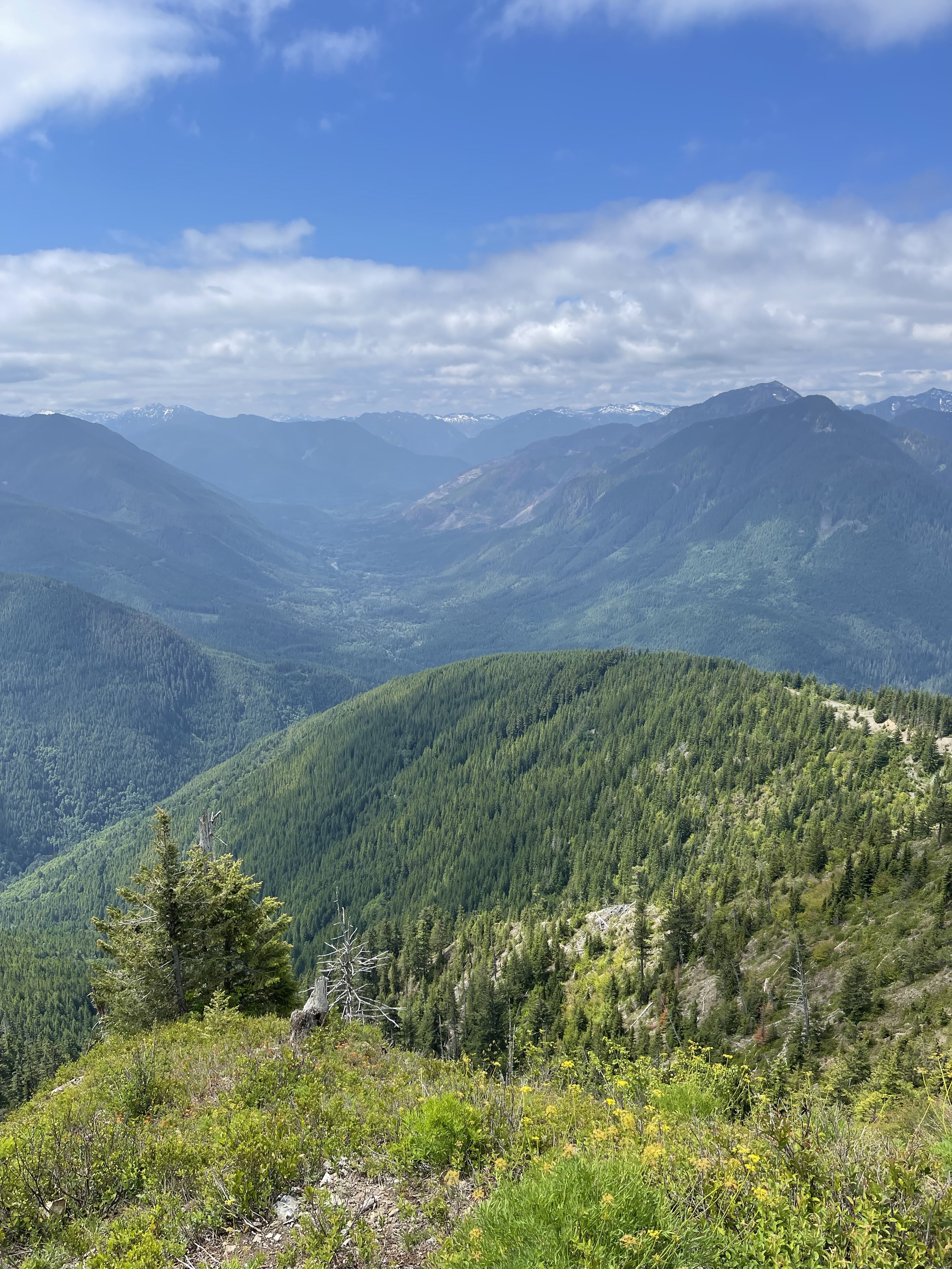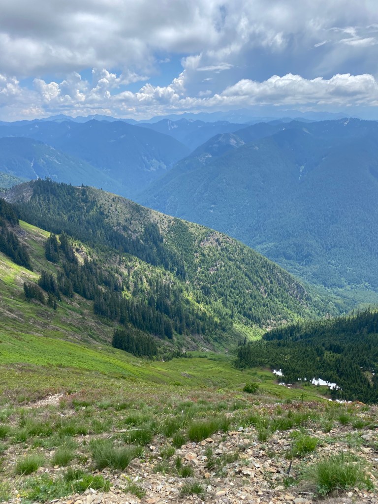 Early summer snow pack is a good sign at this elevation, but the hot weather is still melting winter away, and fire season fast approaches. From our vantage point, we could look down into Beckler River Valley, and see the south edge of Bolt Creek Fire along the hillside. This fire burned thousands of acres, and recovery will take time, but the overall look of the landscape is greening back fast, and new seedlings of all verities of plants and trees are germinating with gusto. Even in the picture below, it takes a moment to really see where the burn scars are, but as you look, you’ll see very bare spots with no trees, in a grey splotch center frame, valley right, below the center snow covered peaks far in the distance. There is still great concern over further landslides, a map below links to current county updates on this habitat and what’s being done to mitigate and restore.