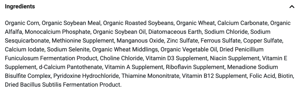 Organic Wheat, Organic Barley, Organic Peas, Organic Flaxseed Meal, Ground Limestone, Fish Meal, Organic Sunflower Oil, Black Soldier Fly Larvae Meal, Organic Dehydrated Kelp Meal, Essential Oils, Vitamin and Mineral Premix. Ingredients may vary – please review each bag’s label.