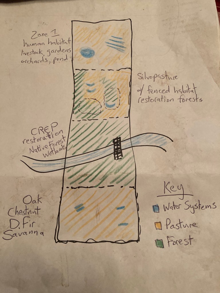 Below is a quick map of the property with the 4 major areas and main focus. The northern most landscape of our property has seen the most change since 2013. We’ve built habitat structure for both people and livestock without pouring any foundations. The pond remains through drought and floods, and still has not reached overflow capacity. The way our climate change continues, it may one day be a mere seasonal seep. Our water table has dropped significantly in a few decades. By redirecting, slowing, and sinking heavy rains on our sloping terrain, we replenish the groundwater enough to keep patches of green around the landscape year round. Our long term replanting vision will embrace more oaks and other drought tolerant nut trees in a savanna setting. This adaptation to dryer, hotter summers and colder, wetter winters predicted.