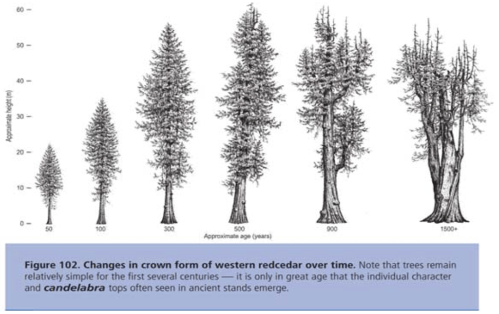 The picture above is a wonderful example of branches re-rooting and becoming braces for the existing tree, and establishing more stability and nutrient sharing. The smaller branches go into the ground at the curve of the “J” and with the continued replenishment of topsoil on the original homestead where this tree is located, the branches rooted and became maturing trees, growing much larger from their new rooted bases. For this kind of low branch development to happen, the cedar must also grow in an open area, where light is available all the way to the base of the tree. Mature old-growth forest offers little direct light to the ground, and the usual growth patterns of trees within a woodland look more like the following diagram.