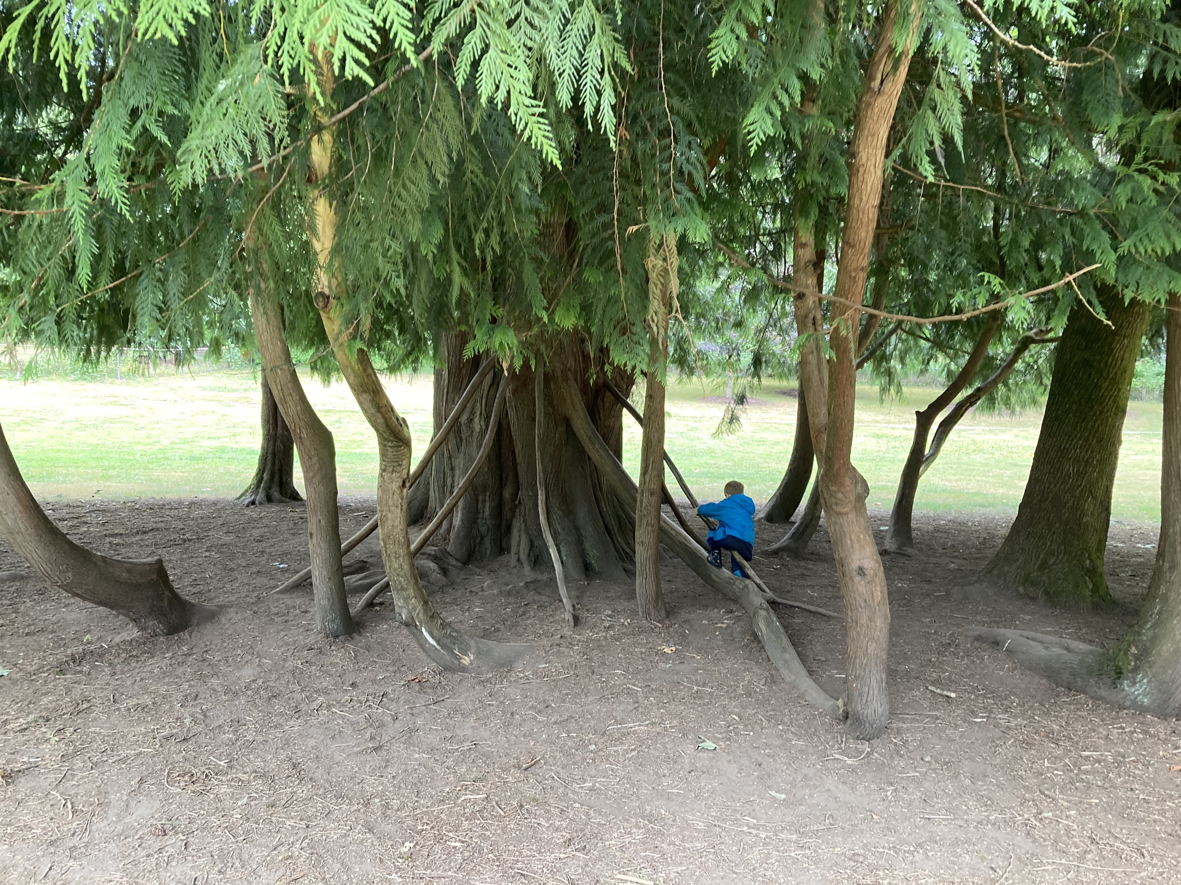 Red Cedars are capable of great feats in adaption to survive. They are often leaning out, way over the rivers and creeks throughout Western Washington, spreading their branches to lend shade to the waters, keeping the temperatures cool for the fish and other aquatic life. When a landslide occurs, cedars thrown sideways downhill will re-root in whatever position they find themselves in, sending out a new crown lead if things go topsy-tervey. Often, when a tree falls over, it becomes a nurse log for other young vegetation. When left to grow upward and stretch existing branches, the skirt of the tree will bend down to the ground and re-root over time. It’s rare to recognize this action in nature, because most of the red cedars were cut one-hundred years ago, and the younger sapling trees around them- the branches that re-rooted, were cut like any other trees in the stand. You have to find protected areas like old homesteads that became county parks.