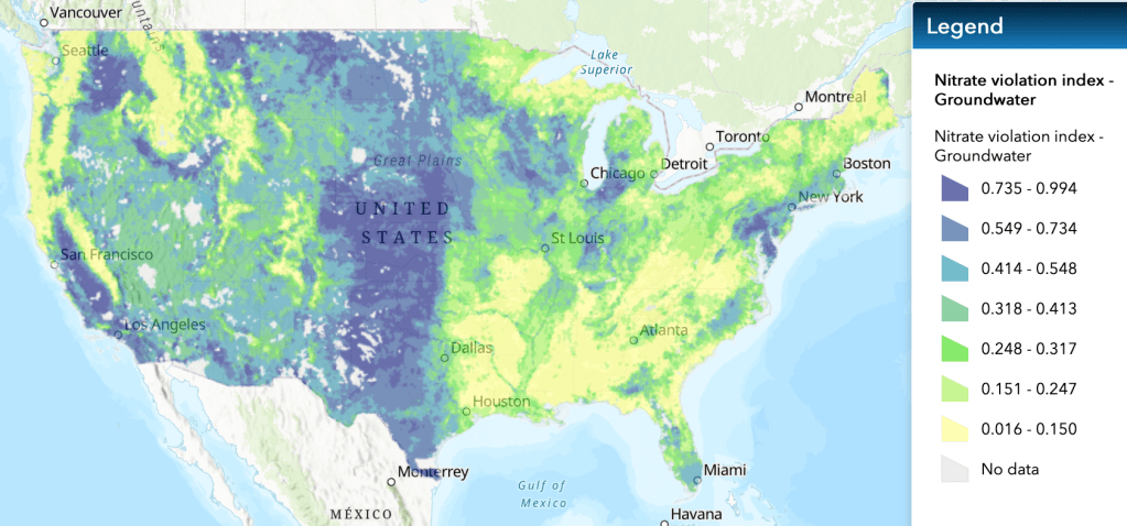 I’d just like to take a moment now for reflection on many of the sources I just shared- they are federal data collected science with peer reviewed studies and decades of research paid for by our taxes to enhance the quality of water- or at least identify problems and stop abuses. Without mapped data like the above, you and I would have no real comprehension or connection between fertilizers mixed into the soil would leech into groundwater and poison our wells. It’s crucial knowledge we can’t go fetch ourselves, it takes elected and appointed collective- society wanting safe drinking water and demanding oversight for the protection of all citizens’ right to potable water. As the studies continue to mount, and more long term research unveils the consequences of our action and inaction.