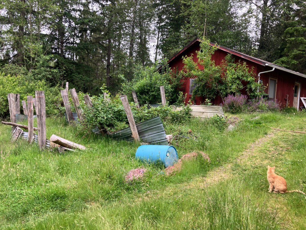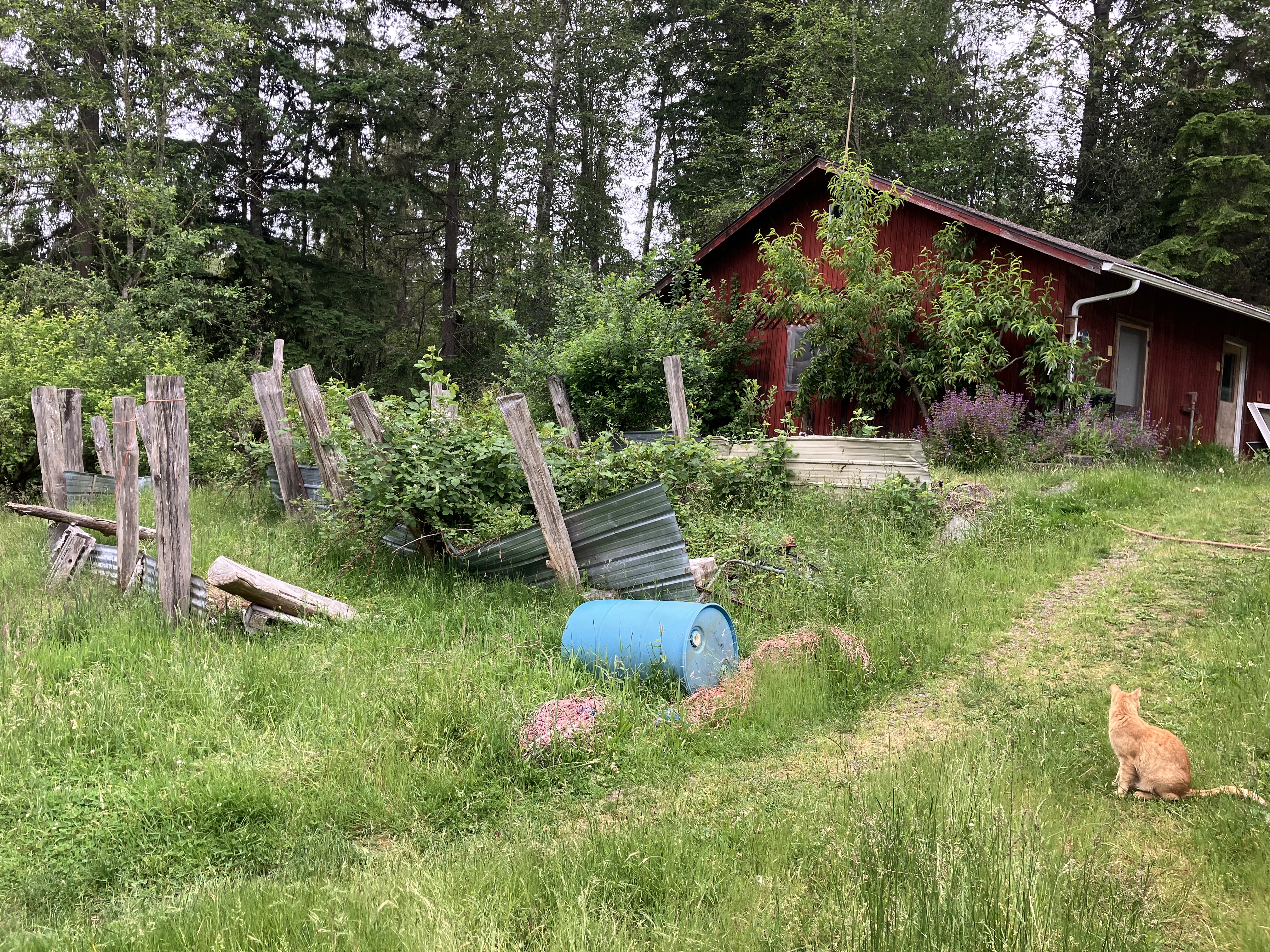 Taking a step back from the tenant kitchen garden, we see other projects which have been put on the back burner until more space is needed for cultivation. These raised beds have never been fully realized, both because of a lack of need- I’ve got more than enough growing on here, but also the amount of fill needed to fully realize these beds is far from ready for cultivation. It’s not a bother, but does make for a strange sight on the landscape, with the pillars holding back the metal walls starting to bow forward without the dead-men bent t-post tie downs planned in the original design. This project was always more work than I liked, to bury the dead men tones of earth would have to be moved and set, which was partially completed when we had large machines on sight moving fill, but other than a few trips of barn clean out in the truck, the beds remain incomplete. But they do offer grazing space fot the sheep, and pollination for the bees- even if the flowers are blackberry. The terraces also help hold the bank below the building, slowing erosion and offering rooted stability when plants establish. In future, a shrub step will most likely be the plan, to help set the hillside and offer shade and good mixed browsing for the animals. Every plan on this landscape evolves as needs change. It’s good to be flexible and not get too caught up in original hopes. When the plans were initially laid out, there was a thought that eight people would be living here and cultivating the land together. Until there is true need for such cooperation and work together in this area to survive. For now, the prep work is there, and when many hands make light work, we’ll pick up where we left off and continue the agricultural expansion. A passive drip system with well established mulch and compost won’t take long when the space is needed.