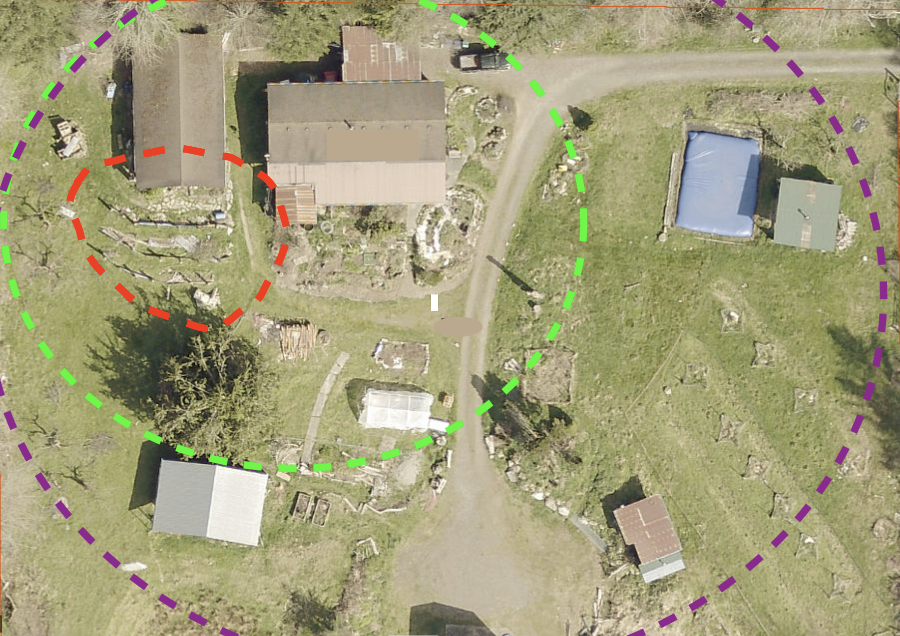 The red circle surrounds a building in daily use. People will walk by and see the area, easily stepping in to tend. These areas are more easily maintained and utilized, so food and medicine plants, as well as the more sensitive species you need to keep an eye on for success, thrive. At the center of this circle is access to potable water, both in the building and outside in a spigot.
