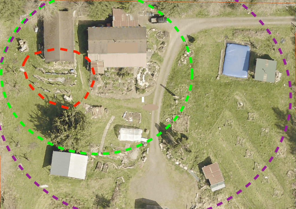 Taking another step back into the next circle (green) from the overhead map, the main house and kitchen gardens come into view, along with firewood storage, pastures, and the towering wild hedge which lines our north boarder on the property. This area is the furthest irrigation watering I do from the house, in 30-45 min cycles, the sprinkler moves around the garden while I weed in the wake of watering. It’s a fun summer cycle that takes a couple of days a week to fully maintain, but that’s minimal to keep a growing patch near the house alive and well. Since I’m not a real gardener- preferring the livestock cycles and hedge setting edges of the land to row cropping or perpetuating high need cultivars. Much of the early plantings when I first moved here ten years ago are beginning to set and survive on their own, and that’s the kind of gardening I like to set myself up for. Less watering, more mulch, chop and drop, and graze down rotation. Zone one areas are usually where all the veggie patches and daily tasks are piled so you don’t have to go far to check up on things. It’s smart planning, as i’ve seen so many people choose to put gardens far from the house and then never end up flourishing because going out there is a task, and the back and forth becomes a chore, not a joy. Step out your front door and make the garden right there so you spend time in it. From the covered front porch I can see all the important gorwings on and tend without much thought. Compost, watering, weeding, and seeding happen within 20 feet of the front door and kitchen. It makes an afternoon of porch time with friends while watering possible, and encourages use of the growing space for in use plants like salad greens, peas, asparagus, garlic, camas, grapes, currents, crab apple, and much more thrive in the richest soil and best kept beds. By late summer, the ring of rich, dark green around the house is much easier to see.