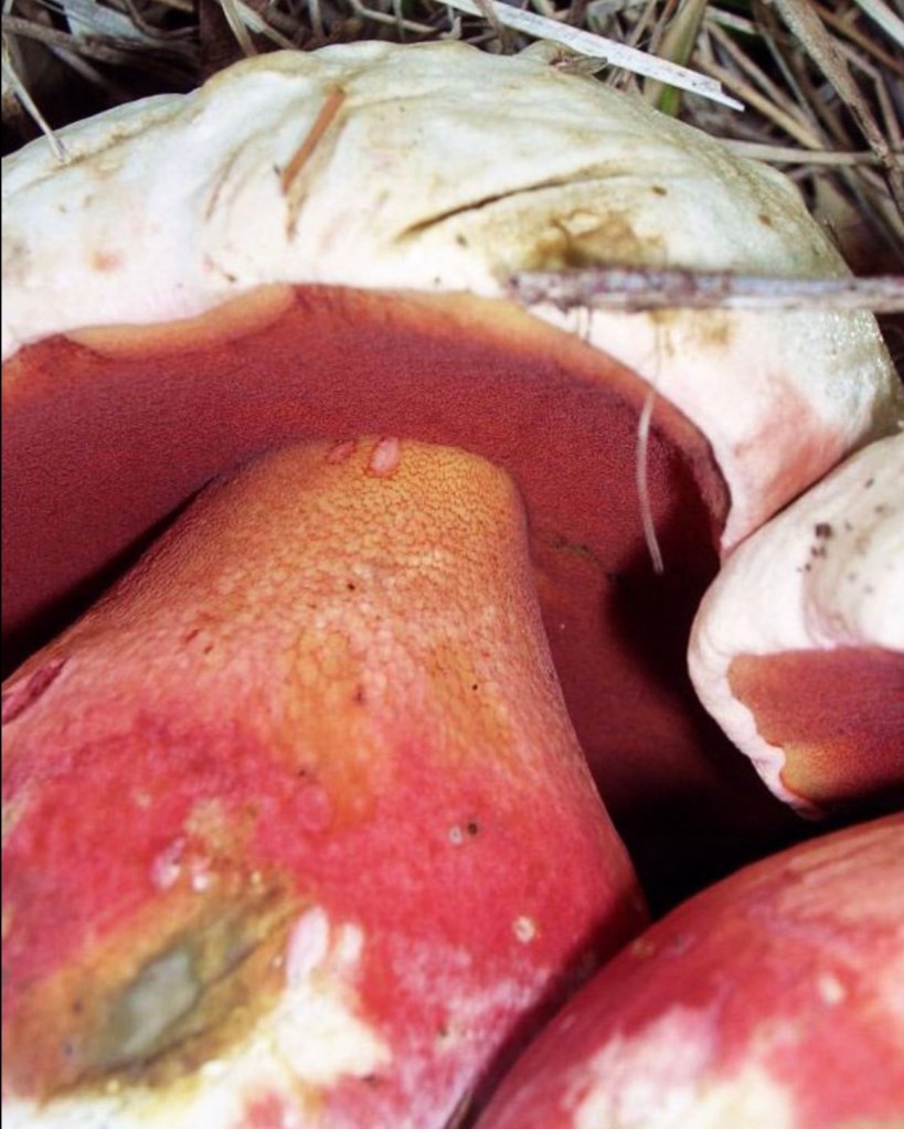 This is Satan’s Bolete, a poisonous bolete most often found down in California. It has a white cap and a heck of a lot more red on it than our brown capped crackled bolete, but for a newbie to mushrooming, it could still be confusing. Here’s a fun site for bolete sorting that might be fun to learn from-