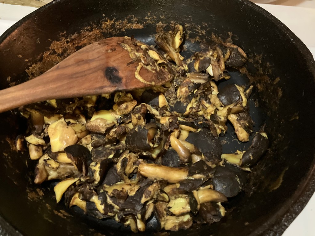 Red crackling bolete is popping up across the landscape here at EEC. Forest mulch paired with grassy, dappled light across the ground invites perfect terrain and substrate for mycological bloom. I’ve been harvesting this wild patch in the upper pasture since first arriving on this property. Over the years, with careful timing, the patch continues. I have to keep the livestock out in early fall, after a week of 40F nights and enough moisture in the air, even without rain, mushrooms leap onto the scene to spread spores and generations of this truly strange fruit. It’s a bolete mushroom- no gills, yellow sponge like spores under the cap, a red fibrous stock, and the brown cap with red cracked patterning, all staining blue when bruised, makes for mushroom descriptions which usually point to poison warnings. But this friendly field specimen is a perfect fresh ingredient for any stir fry or stew. It should be cooked separately to sweat out any water and crisp the meaty caps. Stocks will also brown and crisp with regular stirring in the medium heat pan.