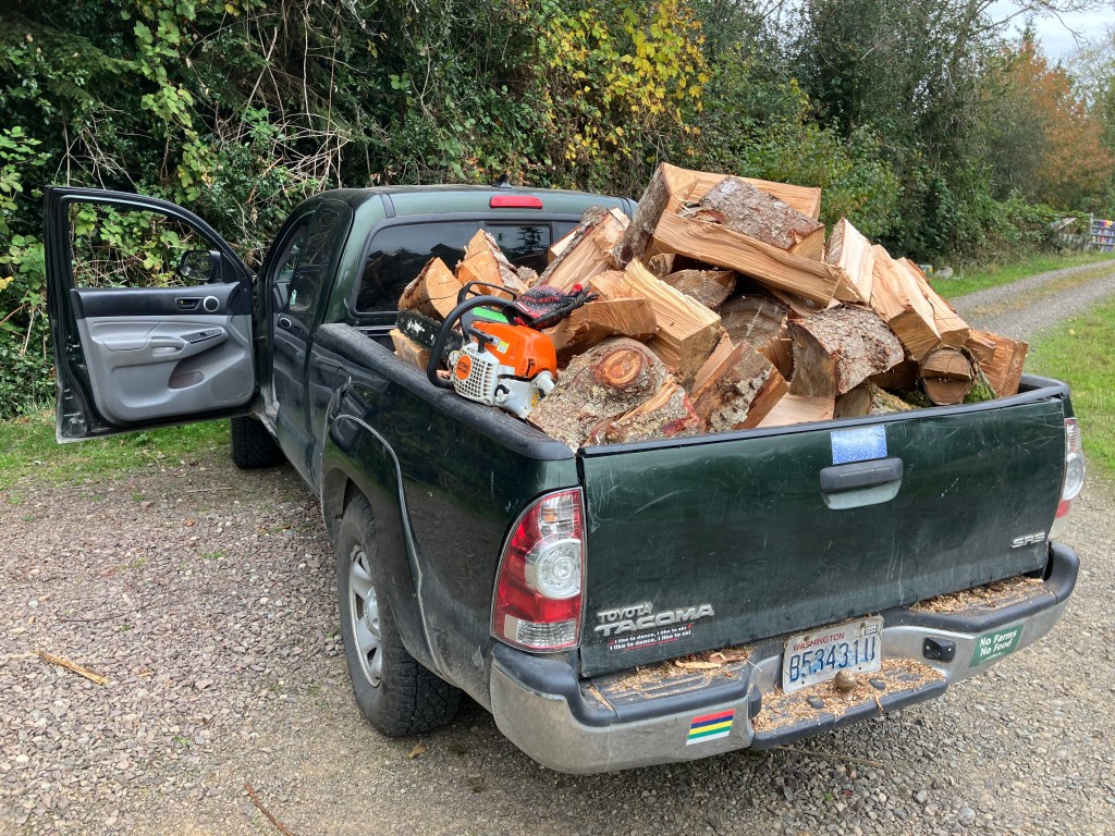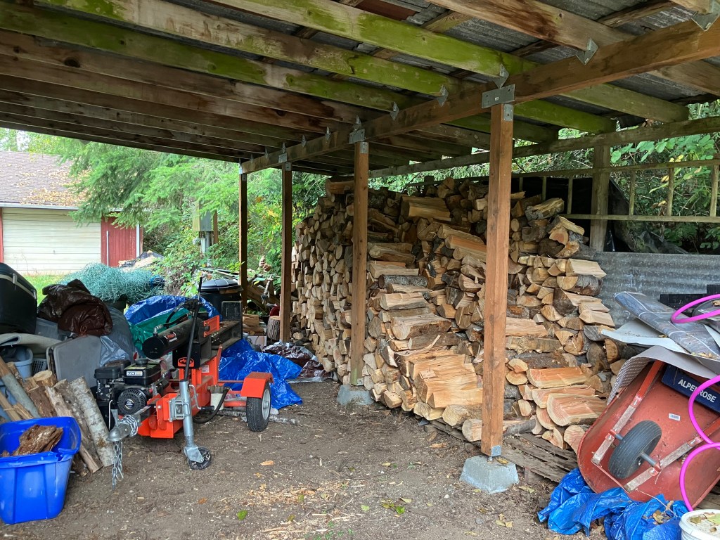 Getting the wood to heat the house is one of the most labor intensive tasks here on the farm. This year, for the first time, I did everything myself. It starts with cutting logs at the tree farm, hauling them home and unloading them in a sunny spot to season over the summer, and then bucking and splitting them in early fall to make sure they are stacked and covered before the rains come. I do borrow a splitter from a neighbor, because axing all that wood at once would break my body. Ten years ago I did my own splitting by hand, now I am thankful to have a machine to help. The stacking takes time too, but it’s such a reward to see all that seasoned wood piled up in the shed. This year, because of timing and an incoming weather pattern, I split and stacked most of the wood in 2 days. It was quite a task, and my back is now a little sore, but very muscular. Thanks to a body that keeps holding enough strength to carry through the hard labors. Within the next few years, I might have to shift how I process wood, because as we age, we don’t get stronger. Thankfully there is great body care to come in wonderful massage from my incredible therapist who keeps my body tuned up for the work to come.