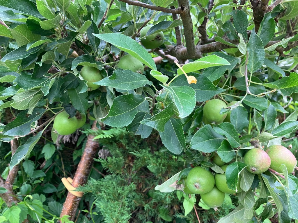 There are abundant cultivars at work in the landscape of EEC Forest Stewardship. Apples are putting on size and blushing red color on the branch while rhubarb and garlic spring out of the garden soil. So much abundance keeps growing all around and the harvest keeps on through these warmer months of high production. Apples and pears are the most common fruit trees on the landscape, but peaches and cherries are starting to gift us with seasonal bounty, and the plumbs manage a little fruit for mid summer too. Most of our apple trees aren’t ripe until fall, but peaches are almost ready by the end of July, and cherries finished at the start of summer. The variety of flavors and plant based foods here at Leafhopper Farm continue to diversify over time. Aronia berries and quinces are newest on the list of newly planted fruits, while grapes took five years to establish. As climate change continues, we’ll be watching all the effects on our numerous verities to keep selecting towards the successful adapters.
