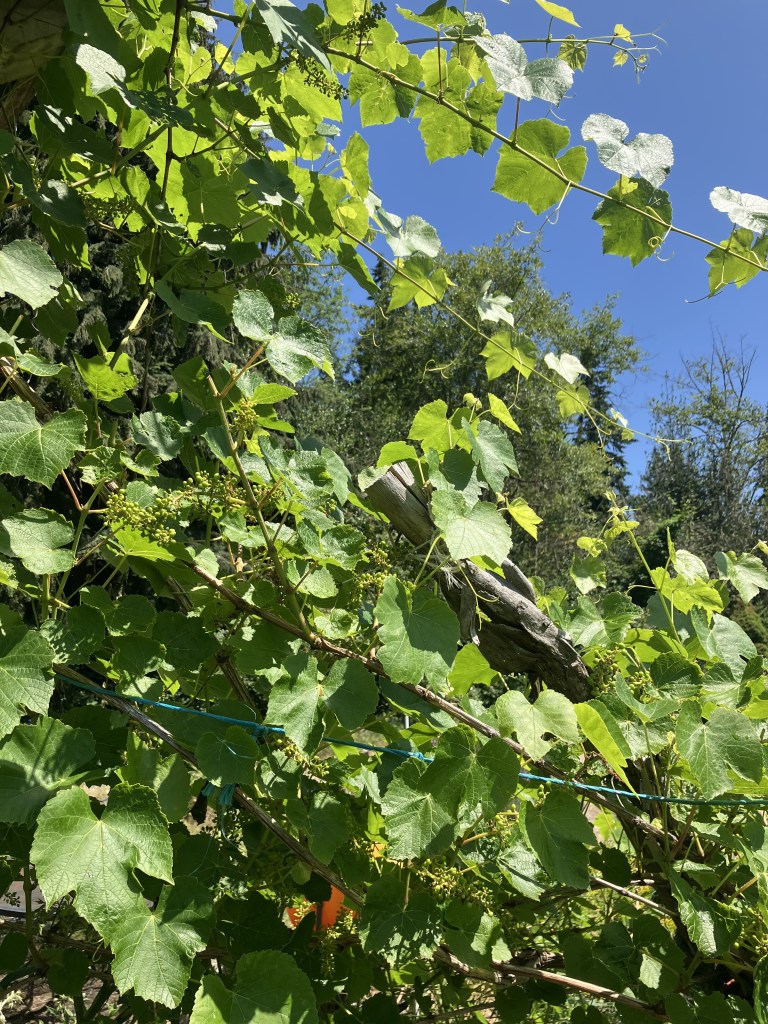 The grapes are coming on nicely this year. I’ve spent some time actually pruning this vine, as it reaches up the side of the porch from our small kitchen garden. Last year we enjoyed a couple of bunches, but this year, the vine has received enough water, light, and warmth at the right time to develop what looks like a bumper crop of fruit. Pollination was a bonanza at the start of July, and I often had to stay clear of the eager bugs flying in and out of this towering green gem. The fruit is some of the sweetest I’ve ever had, and seedless, so we’ll be taking cuttings to propagate this beautiful fruit. Our other grape, an Austrian Grüner Veltliner, is also trying to make some fruit this year. It’s a wine grape, and though neglected at best, it’s managed to fight off blackberry and drought to remain alive and well. I’m planning an actual arbor for this tough little vine, and hope one day to make a few bottles of one of my favorite white wines.