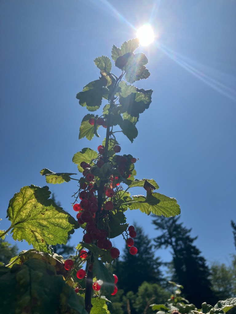 The currents (pictures below) have been quite abundant this year, after taking nearly 7 years to fully establish. I love these often overlooked cultivars, as America only legally allowed their cultivation again in the 1960s after a blight that shook the timber industry at the turn of last century. This is the main reason currents still lag behind other much more popular berry crops in The U.S.. Our native current types on the land are red flowering Ribus sanruineum, black gooseberry Ribus lacustre, and stink currant Ribus bracteosum. The cultivar verities have much more flavor and abundance, so we’ll keep bringing them in for palatable eating.