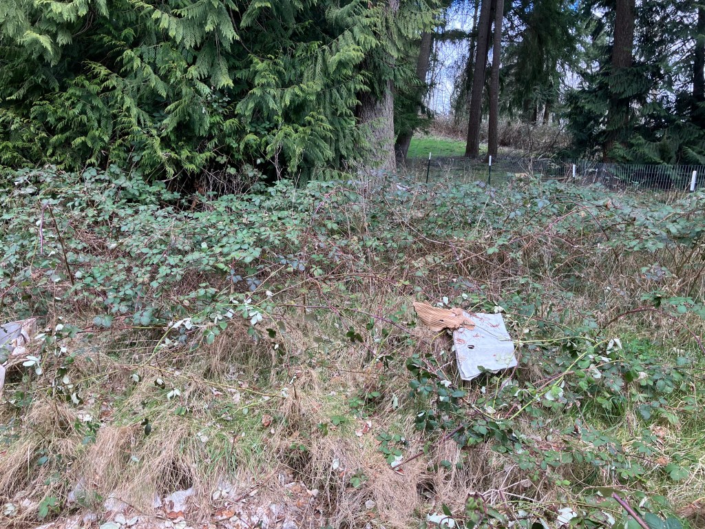 It’s always hard to fully capture the work done, and this final clearing took about 4 hours, with an additional two for replanting and flagging of already established native plantings from a few years before. It was a very rewarding project that I’ve been looking forward to. It marks a final major blackberry hurdle in this pasture, and sets up the restoration in this area for the long term. I’ll have to keep weeding out the space over the years, until the plantings fully establish, but then, like the wildlife habitat corridor at the creek, this space will fill in and also become self-sufficient as a regenerative forest, still leaning in the temperate rainforest direction, but with a new mix of adaptable species that will help keep this forest healthy in the long term climate shift projections.