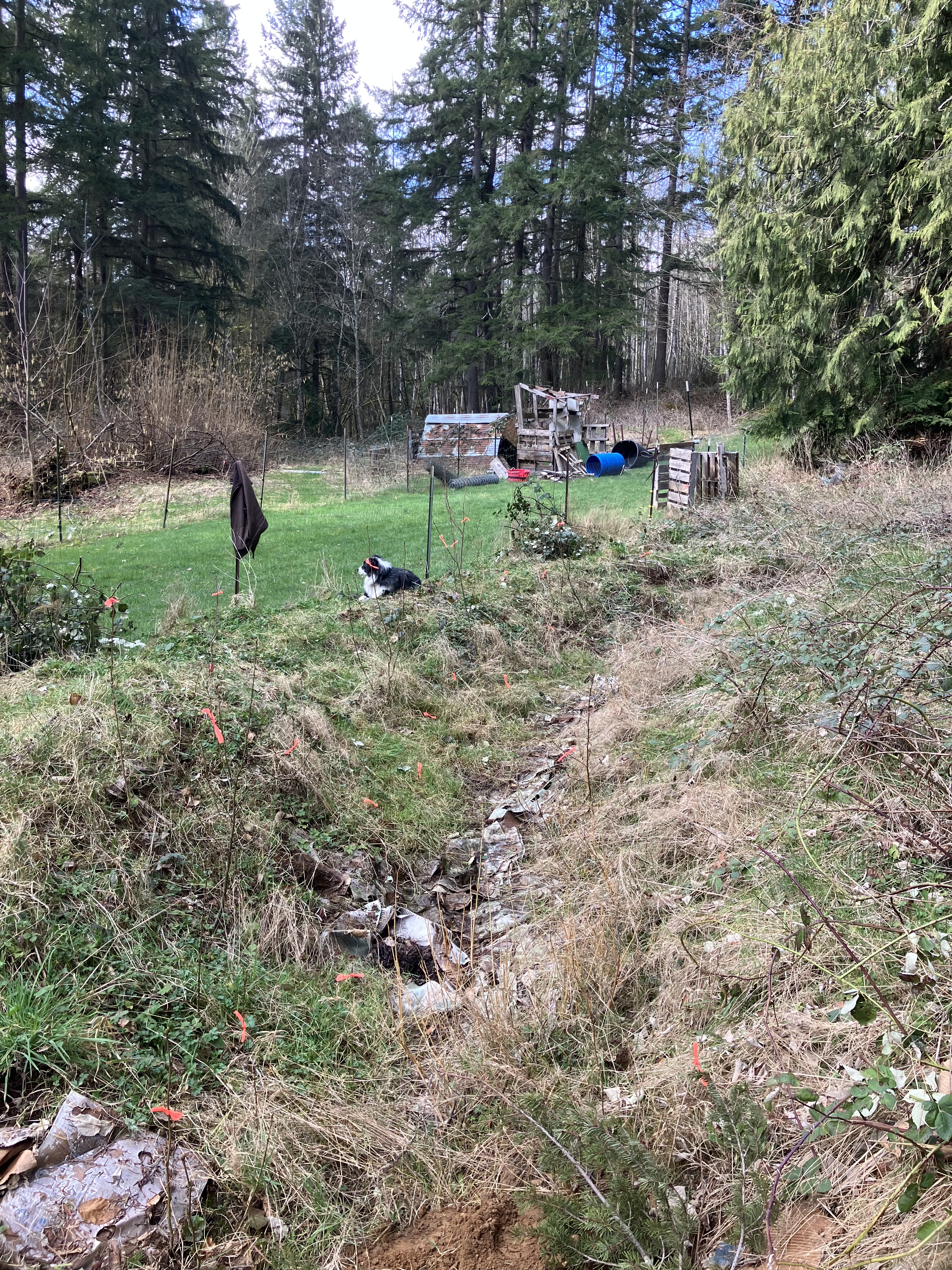There is also an orange flagged planting of a native slide alder, which will be a great understory companion to the evergreen natives as they slowly grow. This activity is happening in the bottom of a swale, where recently disturbed soil invited the seeds to germinate from the surrounding, more mature grove nearby. Why has it taken 50 years to see this usually annual occurrence in an in-tacked forest? In two words- livestock degradation. This pasture has been so heavily grazed- especially in the decades leading up to my purchase of the property. When I first came to this landscape, there was evidence of tree bark stripping by starving animals- an often occurrence in properties where people age out of their ability to fully care for their animals, but can’t let go. Cows and horses stayed on the land for too long, stripping it of all ground cover- from sword fern to seedlings of all kinds, these pastures have not been given the time or space to renew themselves, until now.