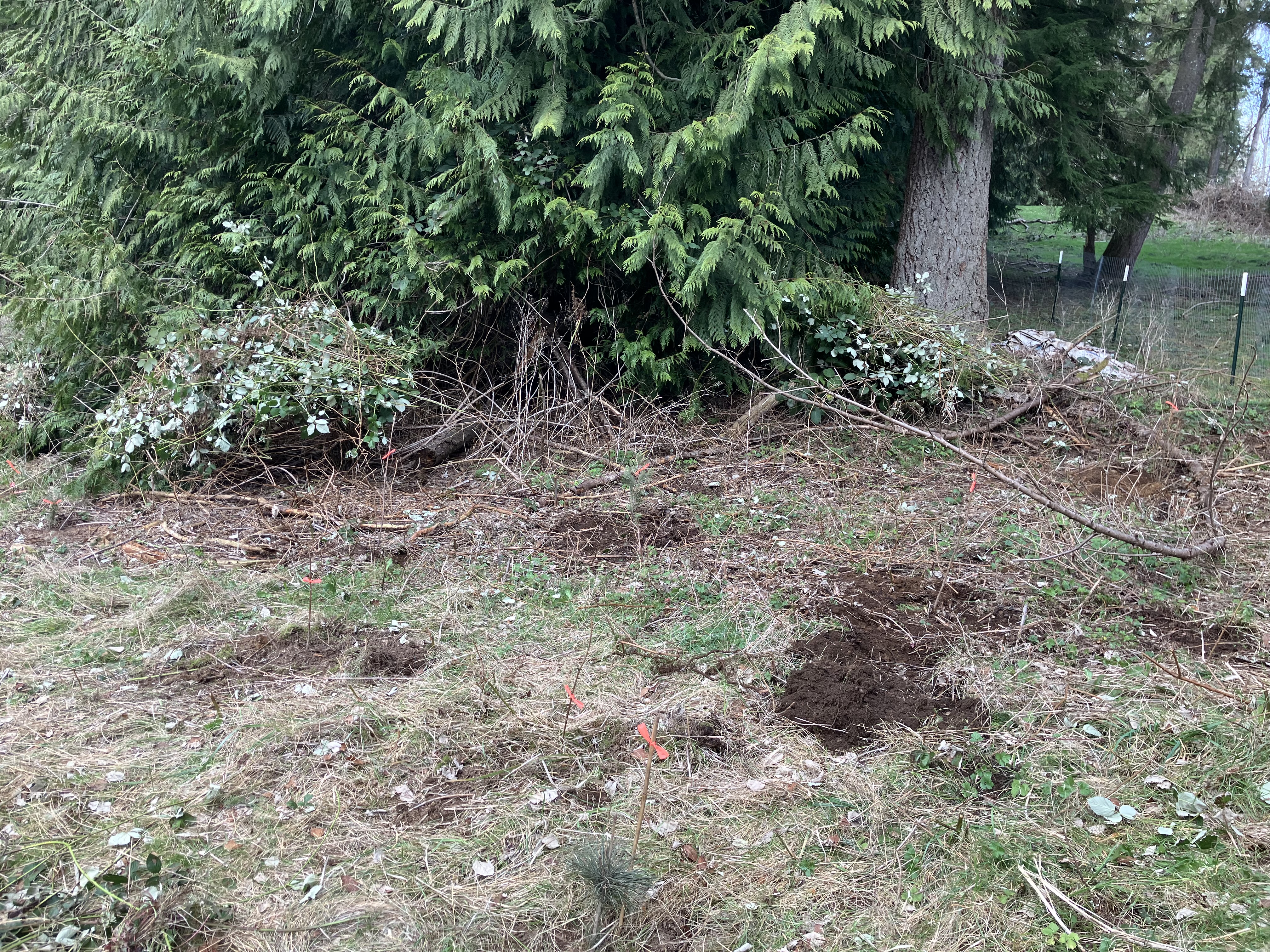 It’s always hard to fully capture the work done, and this final clearing took about 4 hours, with an additional two for replanting and flagging of already established native plantings from a few years before. It was a very rewarding project that I’ve been looking forward to. It marks a final major blackberry hurdle in this pasture, and sets up the restoration in this area for the long term. I’ll have to keep weeding out the space over the years, until the plantings fully establish, but then, like the wildlife habitat corridor at the creek, this space will fill in and also become self-sufficient as a regenerative forest, still leaning in the temperate rainforest direction, but with a new mix of adaptable species that will help keep this forest healthy in the long term climate shift projections.