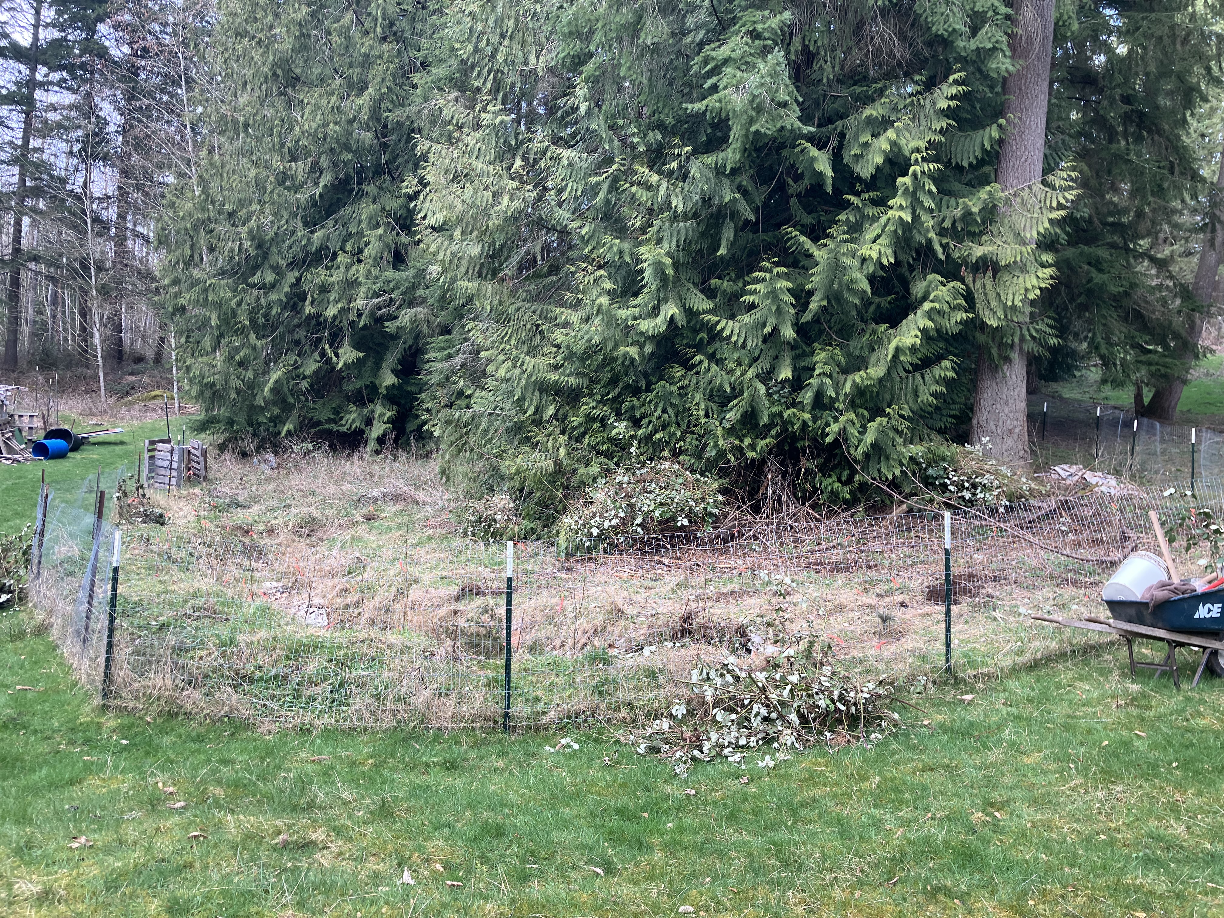 I took a few hours this week to clear out the last patch of blackberry in a recently fenced off habitat restoration area in this middle pasture. There is already a second fenced space next door, where pigs, goats, and sheep had all helped to fully clear the space during the first few years of my stewardship here. This new space was hand cleared of blackberry over time, then replanted initially with more deciduous and understory varieties, and now, I’m putting in a couple of evergreen trees and a few current shrubs to diversify this planting even more.