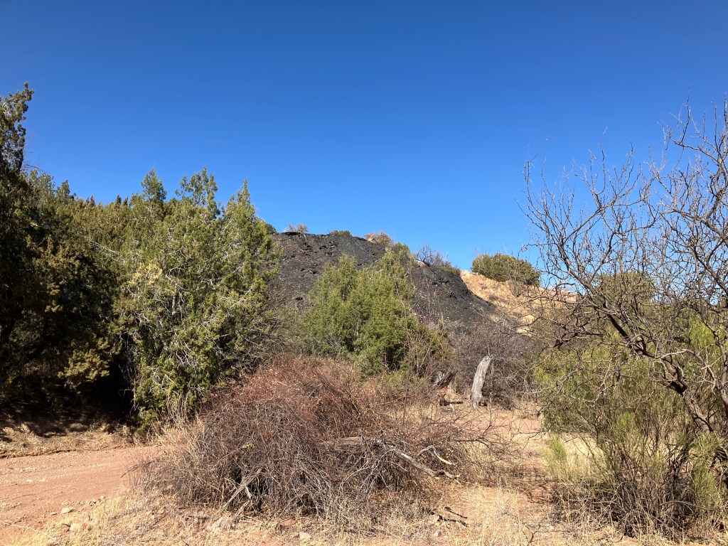 The drive was still a beautiful tour of some wonderful natural beauty. The rock hound in me was tracking all kinds of geology as we drove along. From red sand stone to limestone, there were many variations and colors in soil and sand. That’s part of why the mines are here too, but without any digging, there were plenty of amazing rocks and stones to enjoy. As we began our drive back to Tucson, there was one more off-roading adventure on a forest road that ended up being gated, so we turned around. As we drove back, I suddenly saw this towering pile of what looked like dis-guarded asphalt along the roadside. Looking closer, I realized it was not man made, but a natural outcrop of obsidian. Yes folks, we found a deposit of mahogany obsidian by the side of the road. I had a little freak out, then ran over and climbed into the glass to take in the wonder. It was my first obsidian find ever, and I was ecstatic. Below are some photos of this needle in a hay stack.