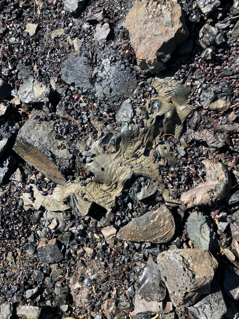 It was a wonderful way to top out the adventure. Though the glass in this outcrop is not pure, I’m sure if I came back with the right tools and protective gear, I could find some workable material. It was an honor to see this deposit and touch the magical stone from it’s formation. I did take a few samples- we were on national forest land and I am not reselling what I took, so it’s within legal bounds of pick up. I did leave some of my hair as a thank you for the rare gift of naturally formed glass. Mahogany obsidian is a great tool stone, and often used for arrow points and needles by stone age people. This stone forms when lava cools quickly, forming an igneous glass rock. Though chert is more likely to be found and used for tool making in this area, the obsidian would also make excellent points and be easier to work in some cases. I was thrilled to find it, and share the discovery with Appy. I’m mailing a few back to Washington in hopes of spending more time with this stone and maybe, shaping some tools. I’m not a great stone worker, but I do deeply appreciate the craft and the sharp blades which come from this sacred rock.