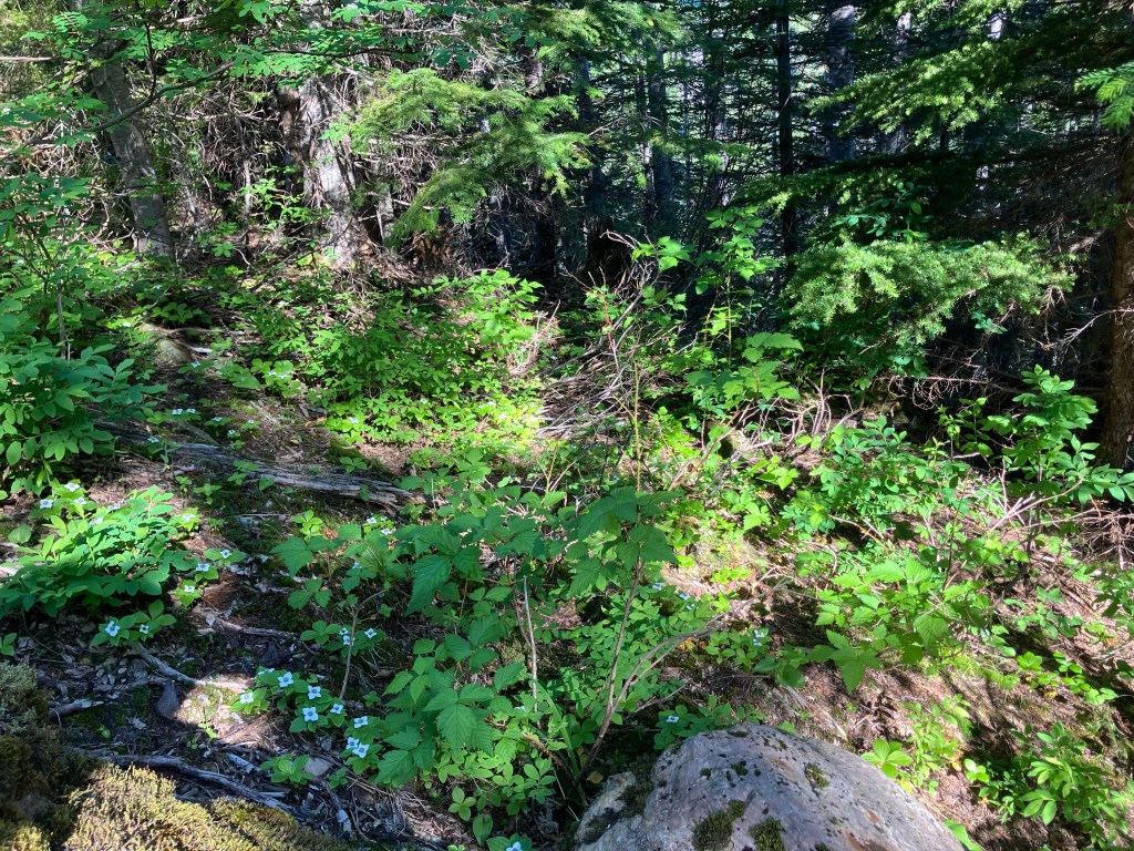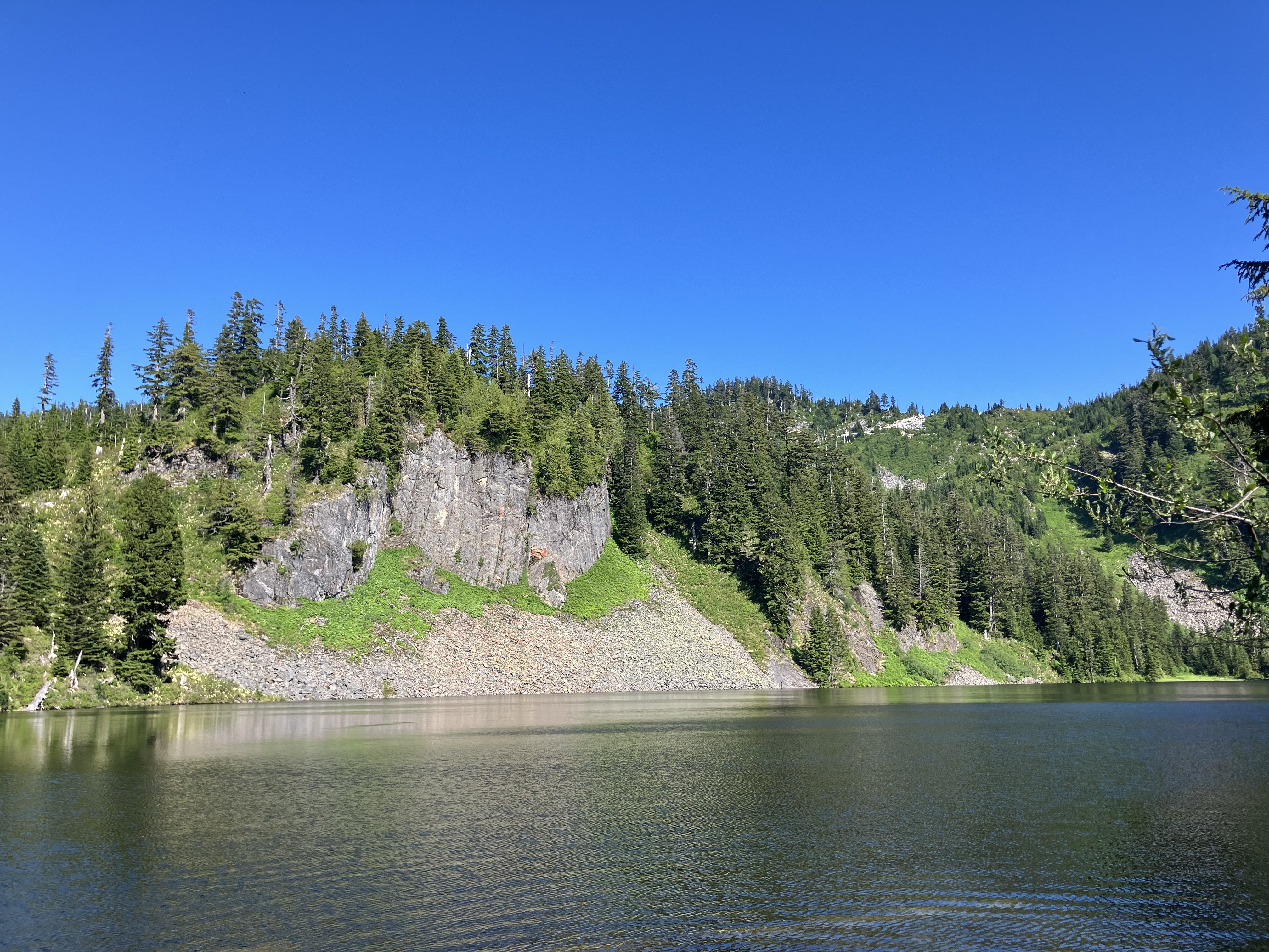 On the last day of June, 2025, I drove up to the alpine region of the tree farm for cooler air and some good back country time. At SCM Lake, I took a trail I had been told circumnavigates the lake, but I did not expect this to pan out, especially because this area of DNR land has gone back to nature in the last few dacades. There is some minor trial maintenance happening by hikers passing through, but it will take a lot of hours with hand saws and clippers to push back the slide alder and willow reclaiming the old logging roads. Yes, this area was clear cut by industrial lumber industries. I think it took till the 1960s to get up this high, but the much of the old growth trees were chopped and hauled out by trucks. You can still see the sun bleached stumps on the slopes as testament to the forest that once stood. New trees are establishing, and a few old giants- mostly wind topped and therefor unappealing to the lumber market, stand as beacons on high scree fields or along the lakes that dot the low pockets between ridge lines.