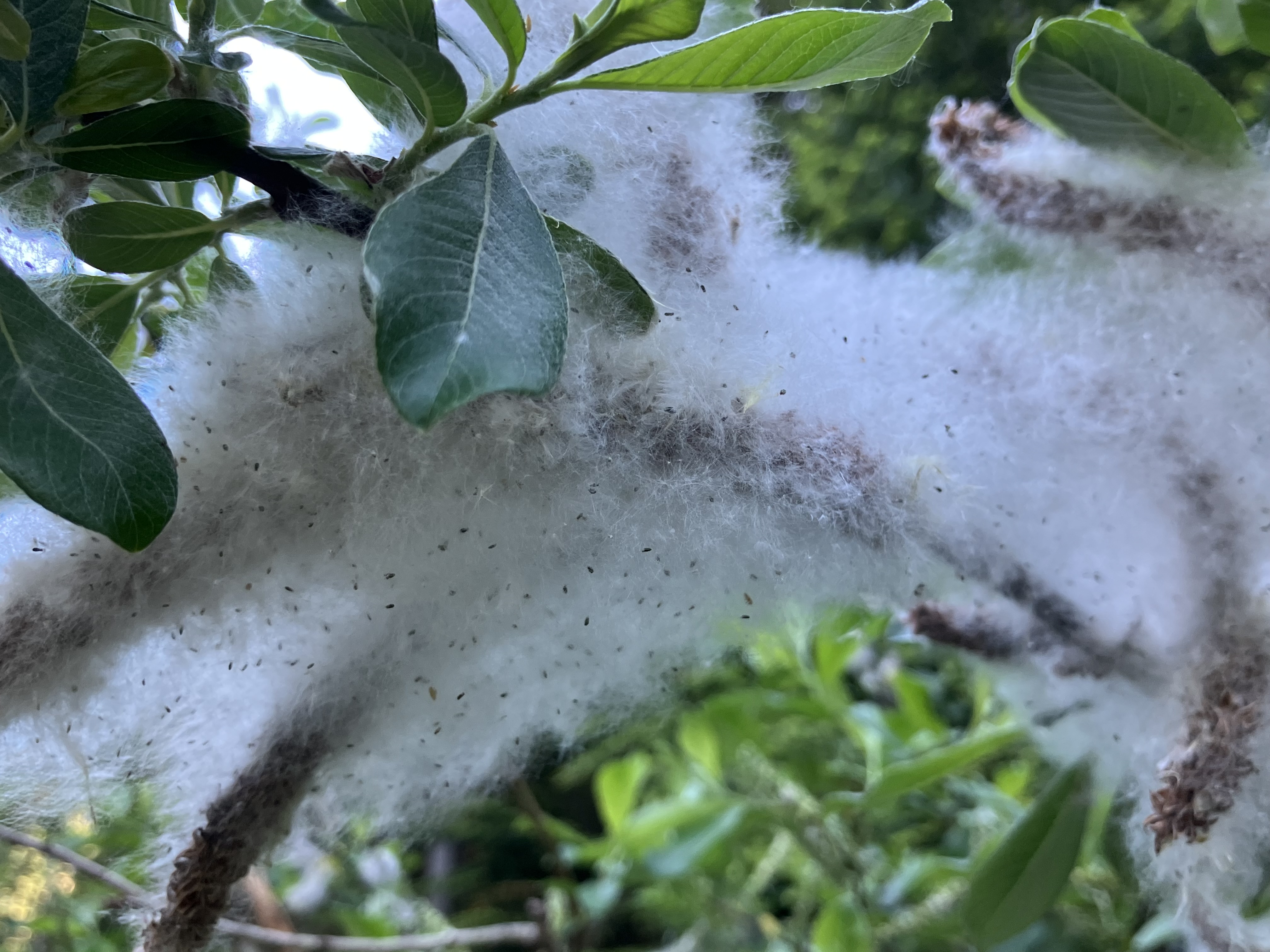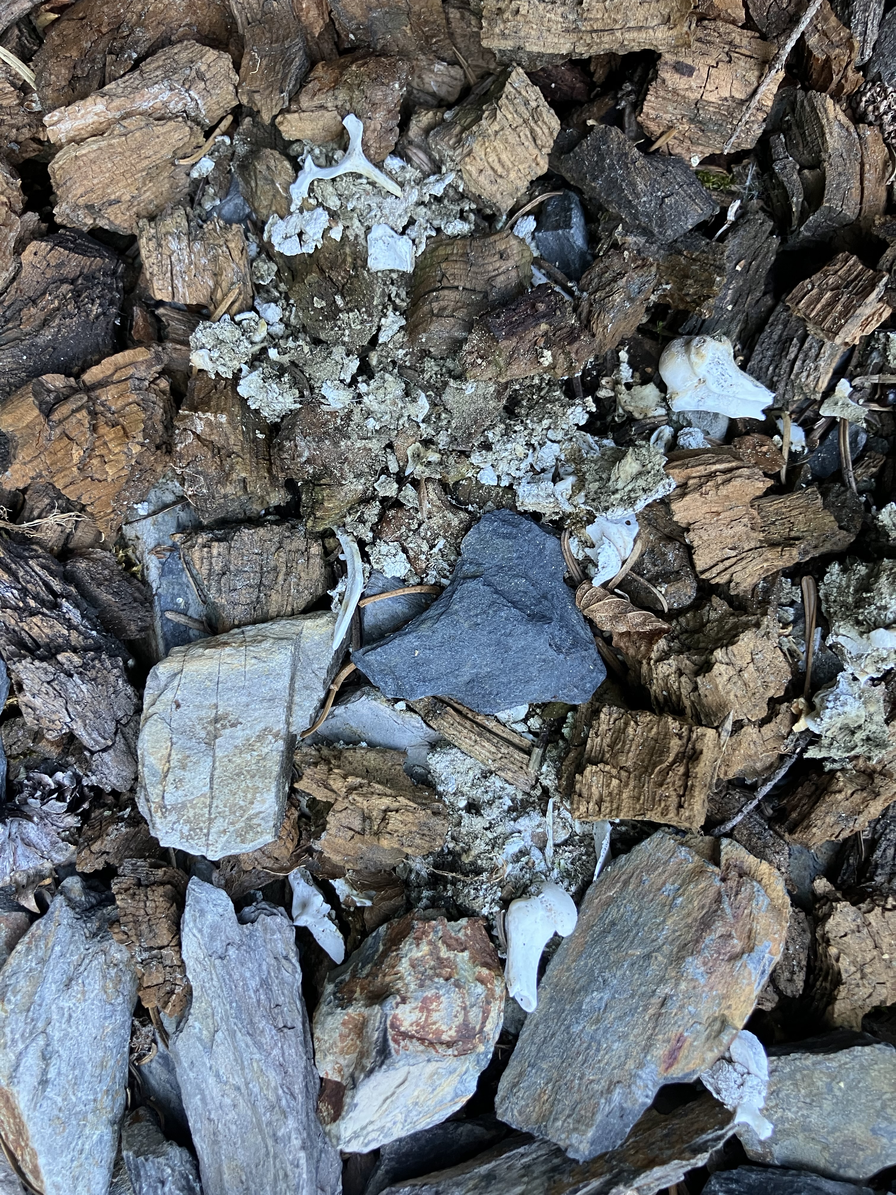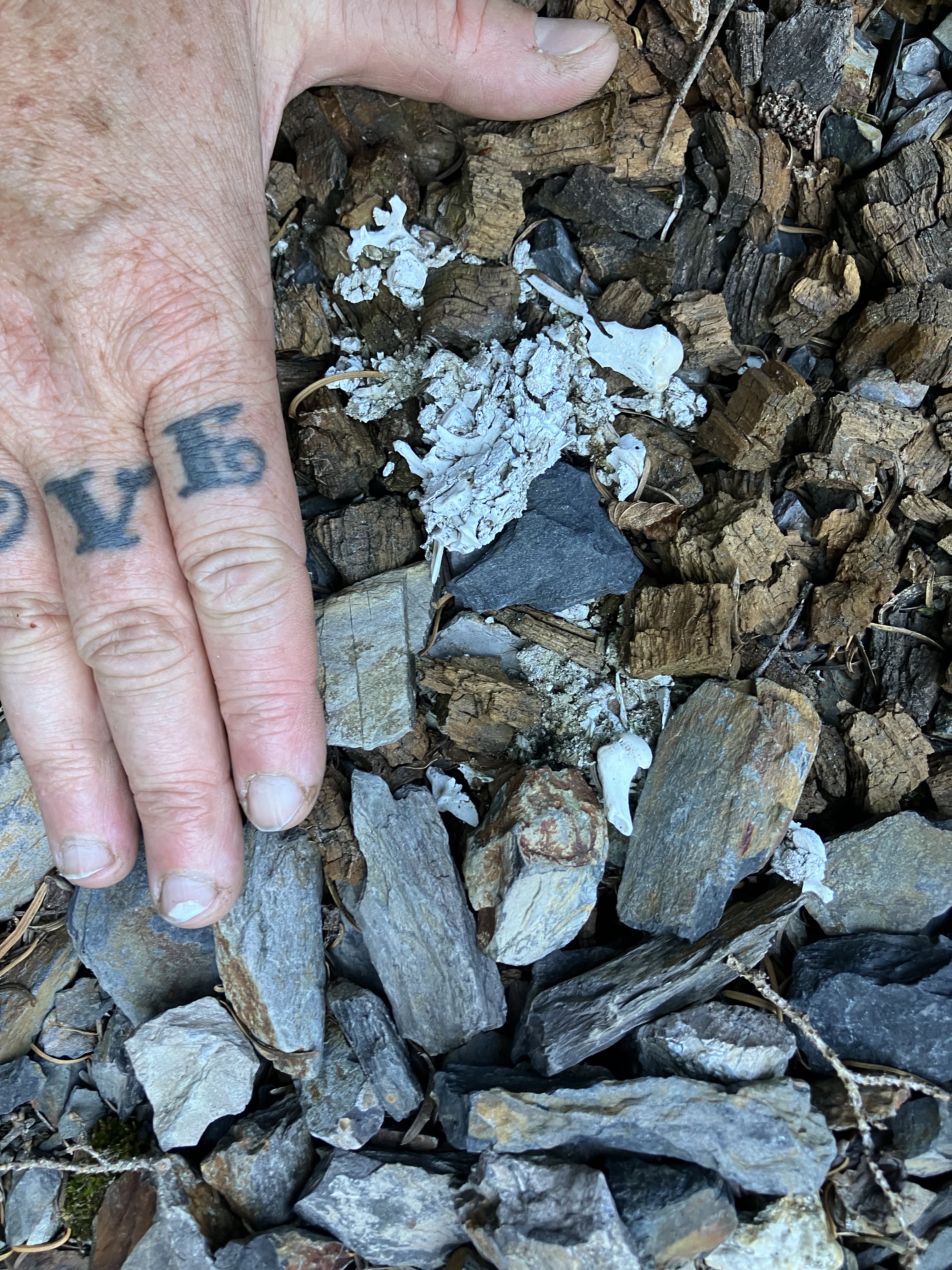 The trail I chose goes south of SCM Lake, along one of the old gravel roads. Sixteen foot high willows bend their branches out into the sunlight along these clear avenues along the steep mountain sides. There were large boulders to scramble around, along with crumbling frost heave edges to avoid. My dog Val picked the trail through some slide alder, but eventually, I had to choose my own way through the woven branches, not being low to the ground and able to slide under the low branches and arching canopy all around. It was still smooth travels, and I began to pick up on the wildlife trail I was following. What moved through these highlands and matched my size? Elk, deer, cougar, and bear. As the road began to climb up, ascending to the ridge line above, I began to look around more closely for animal sign. Scat is common along wildlife trails, and I soon came upon some old, but interesting segments of poo. The masses were white with bone and age, sun bleached, and probably buried under snow for a bit of time this winter too. What I guessed were rabbit bones volunteered themselves out of the decomposed hair and powdered remanence of the scat. I could not tell what animal might have left this dump in the woods, but the bones told me predator of some kind. Later, I stepped over a massive pile of salmon berry seeds. Since the plants are only just flowering at this elevation, I concluded the pile was left in Spring of 2024, and, because of the size, that a bear used this trail. Coyote will also have seeds in their poo, but not such a massive pile as this. It was a dinner plate’s worth of spread, no coyote could crank out that kind of refuse in one movement.