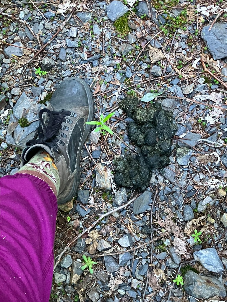 As I turned to pick my way back down from this trail’s end, Val became quite animated and headed off the south side of the ridge, away from the road and our path. She came into a clearing of small boulders and began sniffing all around excitedly. I assumed she was tracking a marmot or pika, but then I saw some truly fresh bear sign and join in my dogs excitement.