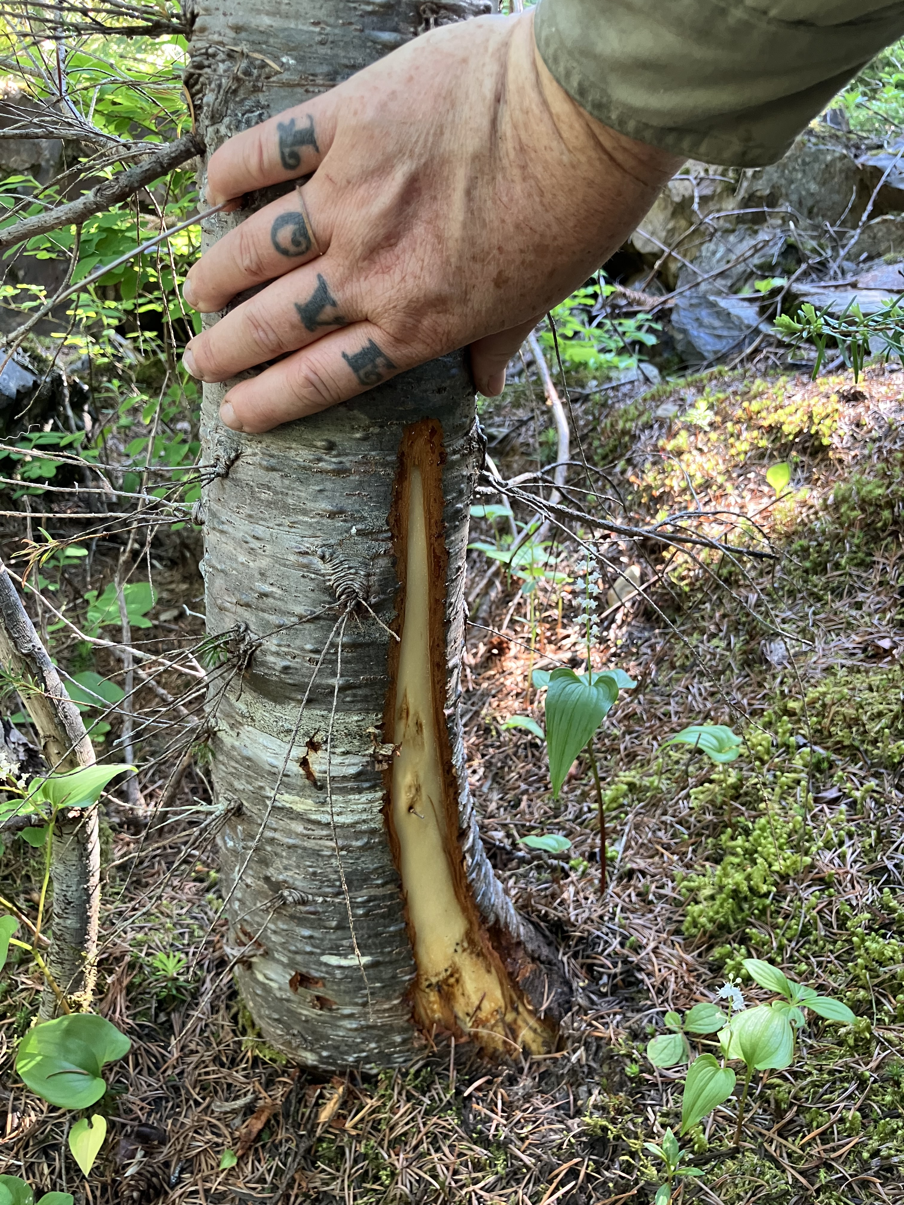 We left the clearing and headed back down the road. I kept an eye out for more cambium feeding, but saw none along the gravel road, which was not a huge surprise considering most of the trees on the road are deciduous. It felt like we’d stumbled into the bear’s living room, then headed back out onto the street to give it space at home. Of course, the whole area is the bear’s home, since black bears are known to travel several miles in search of food. They tend to stick to familiar paths and home ranges, not migrating over vast territories. If their larders are drastically changes, say, with clear cutting or the development of a neighborhood where forest used to grow, the bears die out, because they have great trouble relocating to unknown areas where they did not grow up learning about food sources from mamma. Bear trails are often ancestral, meaning many generations of bears share the same larders. The trail I was on today is a well established bear trail, also used by other wildlife traversing the area. Roads are often used by wildlife to get around. They seek convenience the same as people, only we make vast cuts into the landscape to extract natural resources on industrial scale, not on foot with our bare hands like the other animals. It’s sometimes quite hard to fully grasp human scale on the natural world, but it’s short sighted at best.