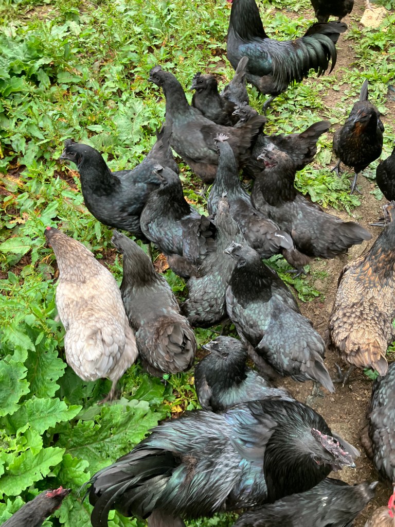 The chickens are thriving on a landscape at it’s growth peak. As I move the young hatch of chickens from their youngster pen to the coop, where an established flock will need a few days of integration with the newbies. Young birds need a group of buddies for successful mixing into an adult flock. After a decade of lessons and learning by doing- with a flock of about 30 birds, I’ve found that a 10 young birds is ideal for introduction, and six minimum for survival. Small groups of five or less get fragmented by the larger flock and picked off. Safety in numbers really does apply in this species. After three days of confinement- with extra feeding, the whole group gets let out again to free range and the young birds now know the coop is home. With the introduction of 10 new birds, I’ll need to cull at least that number in the Fall to keep the healthy number preferred in this system. 30 remains the magic number, for the flock health, with two roosters. I get more than enough eggs to sell and share, as well as keeping grain costs manageable.