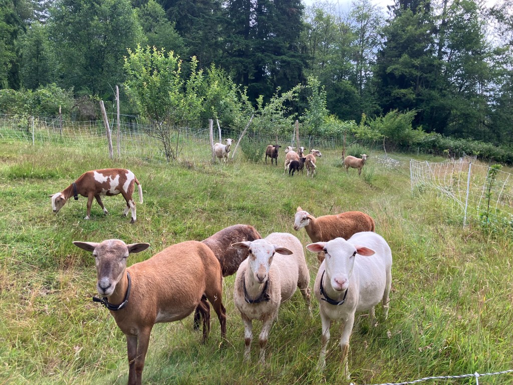 What you put in is what you get out. The sources really do matter, and your animals will show you what’s missing, in their health and well-being. Weight can fluctuate a bit- more noticeably in the sheep, especially when they are nursing, some ewes are better at transferring nutrition than others, and that goes into the long term breeding shifts I make for the health of the herd. Long term breeding lines are great at transforming the brush and grasses into good meat and healthy carcass size throughout birthing cycles. The ewes that don’t are culled out over time, but it takes a few years of observing lifecycles before making such choices. I had a ewe who became Skelator each lactation cycle, but her ewe lambs did not carry on the habit, so she was not culled for that trait alone. Not many sheep are culled for a single flaw- unless it’s a huge one, like horns. Ability to convert pasture to meat each year is greatly increased by rotational grazing methods, which are in full swing by early July 2025. Rains and cooler temperatures have given us a very productive second growth after initial Spring grazing rotations. Careful planning and reseeding has brought in clover, plantain, yarrow, dandelion, dock, and several grasses in a pasture with additional hedges to brows, creating that diverse diet from no chemical methods of holistic, restoration farming practices.