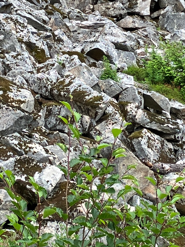 The hike out was peaceful, with swainson’s thrushes echoing across the mountainside. On the way in, it had been silent, and I wondered why the birds did not start singing until later in the afternoon. Many birds are nesting right now, and a few flushed from their nests in agitation as we went by. The other occasional vocalization from nature was a pika. The chinchilla sized dark gray rodents thrive along the scree fields in these high mountain ridges. It takes the eye a moment to find them amongst the boulders with patches of lichen in similar shades of brown, black, gray, and white. This incognito persona protects them from predators, especially those from the sky. Can you find the pika in the picture below? It’s standing full broad side, head facing right. It’s making an alarm cry, and if you look to the left of the taller slide alders in the foreground, you might see it.