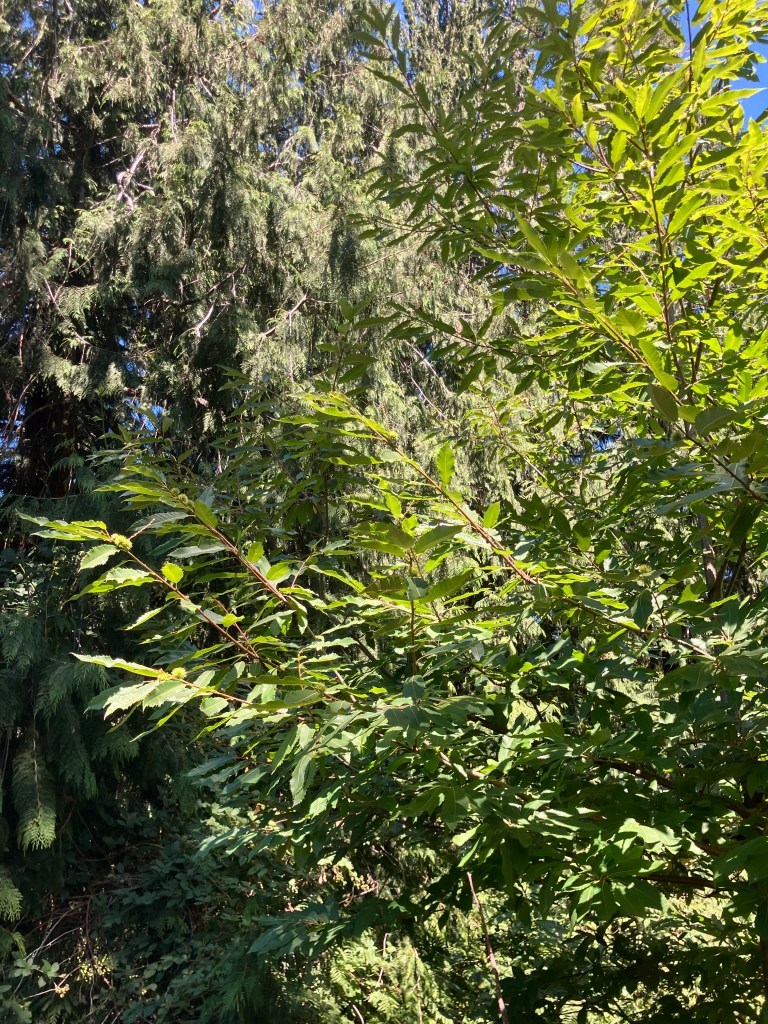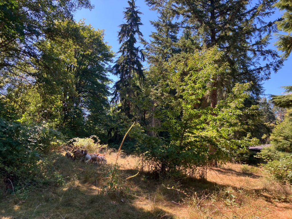 It’s mid August here at EEC Forest Stewardship and the fruit and nuts are on. Though chestnut harvest will happen later this fall, it’s great to see so many burrs forming on the ever growing branches of these hard wood masterpieces. They are flanked by blackberry understory, which I’ve been harvesting by the bucket loads this summer. Though this bramble is usually a foe to be hacked back, it also gifts us with a fine crop each year, and our Cascade Katahdins love browsing the lush leaves of this invasive plant. I’ve been reflecting deeply on this vegetation, and find it’s trying to tell us something crucial about our environment- plant trees. When a shade of continuous overstory comes back, the blackberry goes away. It cannot live in an evergreen forest, and so, plant back the rainforest and remove the blackberry. Even with the slow return of the trees, I find myself cutting a lot of cane in late summer, after the flowers have bloomed for the pollinators and ripe berries are picked. First year cane can go any time, and I have to cut it back anyway, to reach the older growth where the berries are. Nothing cut goes to waste mind you- even if it sits on the ground where it drops and decomposes, the dead carbon material and green manure are wonderful for the soil. Remember the old permaculture adage- the problem is the solution.