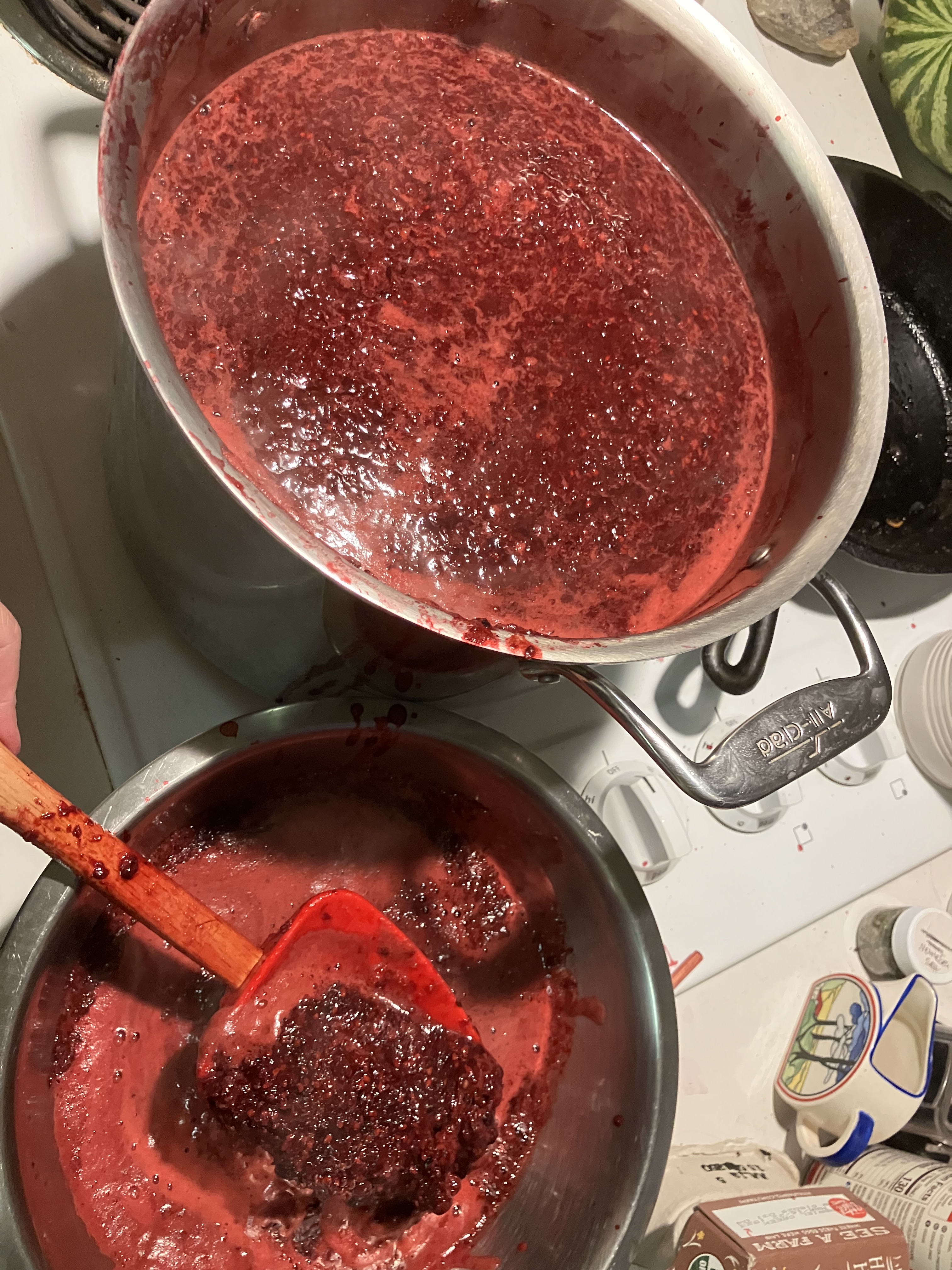 While cooking the fruit before fermentation starts, I take time to skim off froth and sift out some of the seeds. In my first batch, I did a lot of sifting. In the second batch, I only skimmed froth, and left most of the seeds through this first step in fermentation. After 2-3 months, I’ll rack the wine, sifting out all the fruit pulp and seeds, then let the liquid ferment another 2-3 month before bottling. It’s good to get the sediment out of the wine before final fermentation, otherwise you’ll have a lot of gross lee in your wine, which can develop funky flavors in time. Still, I like having the whole fruit in the wine for the first few months of wine making. It invites more fine lees into the wine, for complex flavors like nuts, honey, or bread in the taste, the dead yeast cells are included in this fine sediment that you might like in your wine. I’m not quite that advanced in my wine making skills yet, but every year I learn a little more, which then improves my wine making. I hope to have one of my most comprehensive batches in 2026.