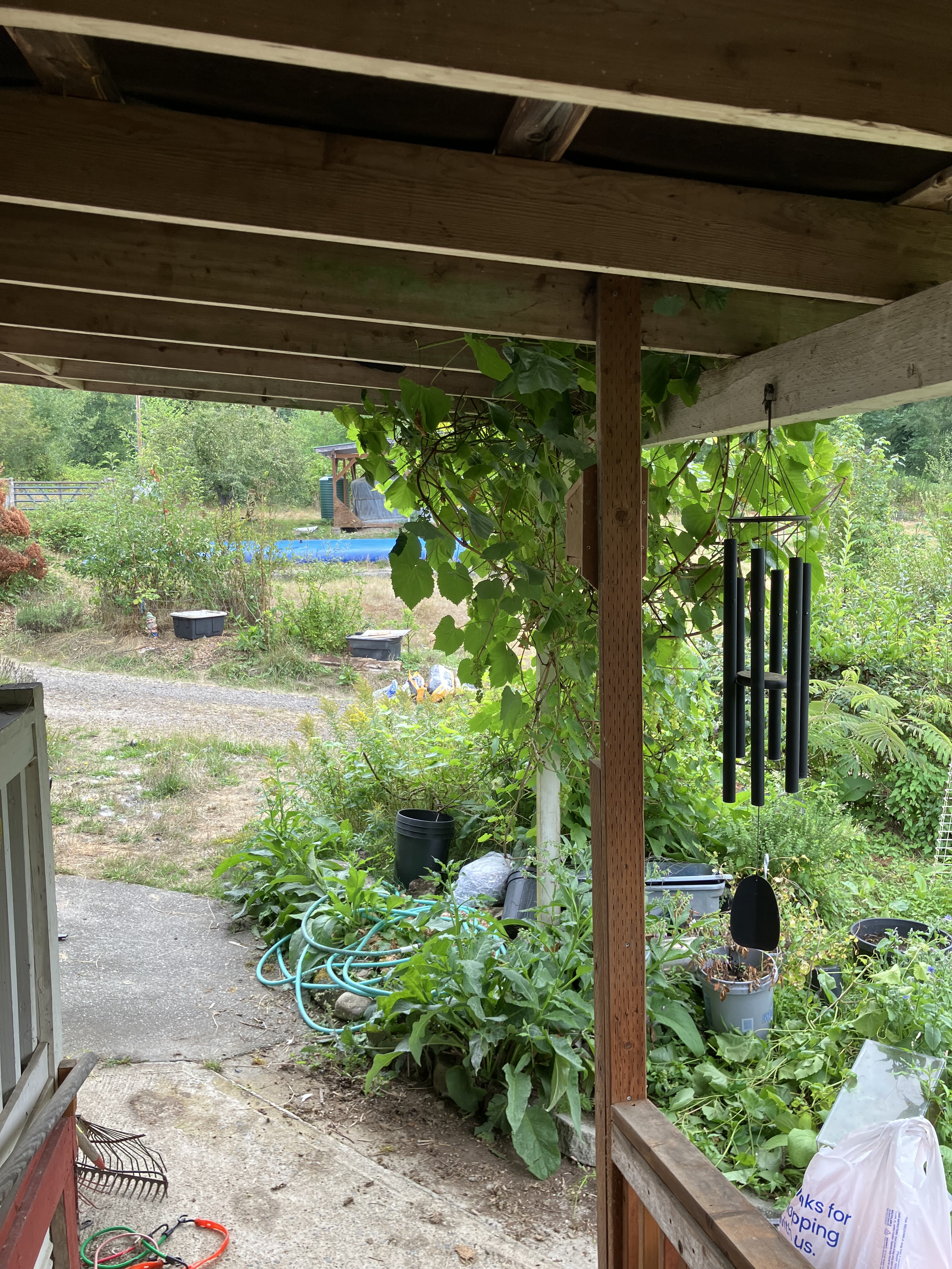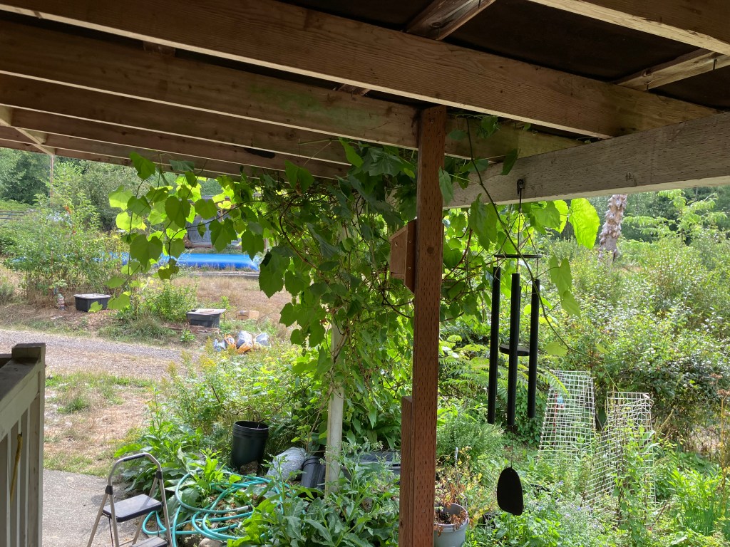 There is so much bounty in late summer here at EEC Forest Stewardship. We’ve been sharing the harvest with neighbors and friends, and receiving as well. Cucumbers and radishes from a neighbor’s amazing garden, baked goods and jam from other friends who came and picked blackberries, and more of the berries themselves, a fine crop this year, and good return for all the struggle keeping them from overtaking the landscape. There were rains in August, which set off another growing spree, and seed germination in any bare soil. I’m cutting back the grape arbor for a second time, watching the final maturity on the fruit, to harvest before birds, insects, and mold moves in. The weather is cooling off enough to invite mildew, so cutting back the new leafy growth on this plant will help ventilate the grapes to repel unwanted spoiling.