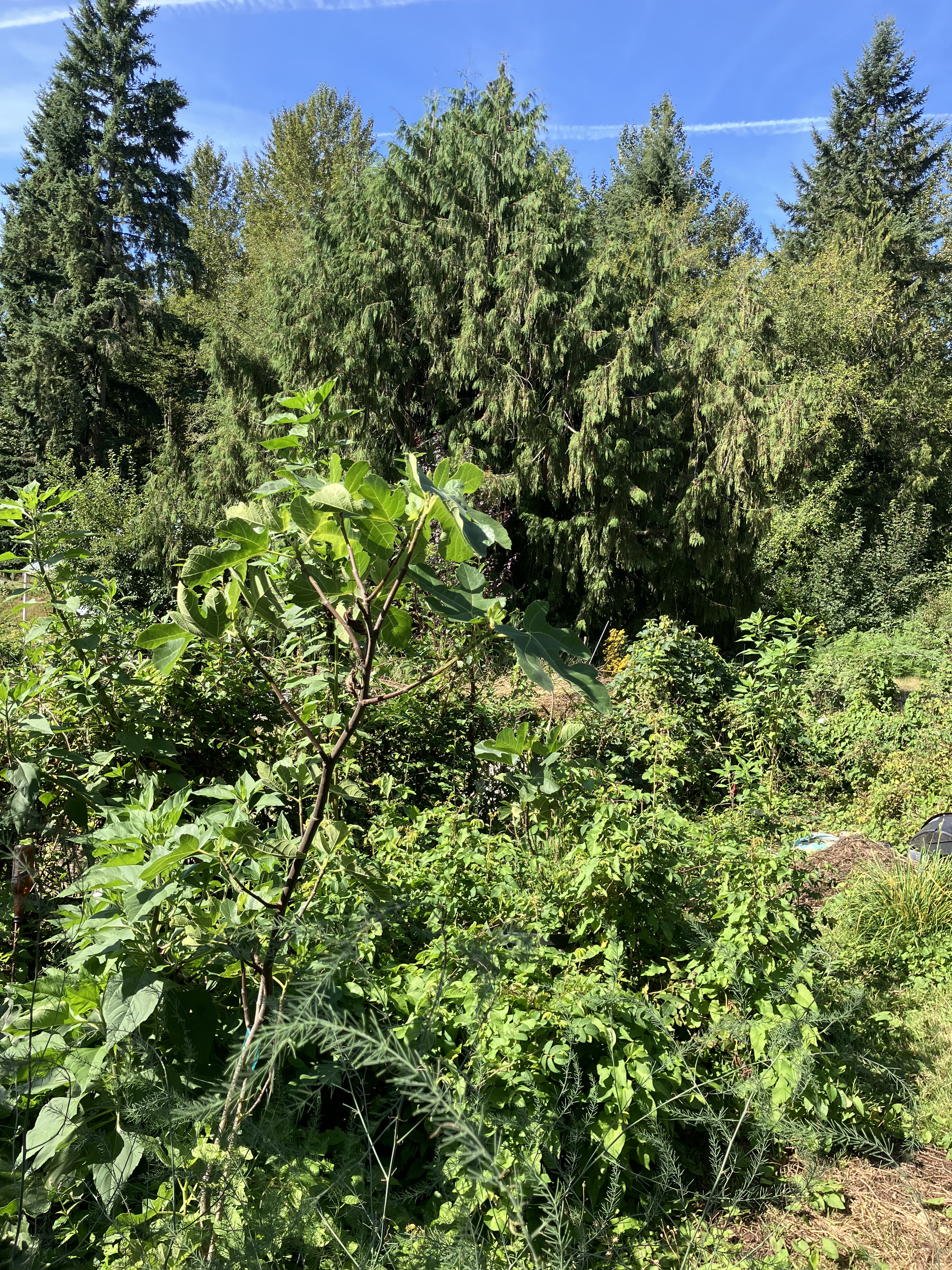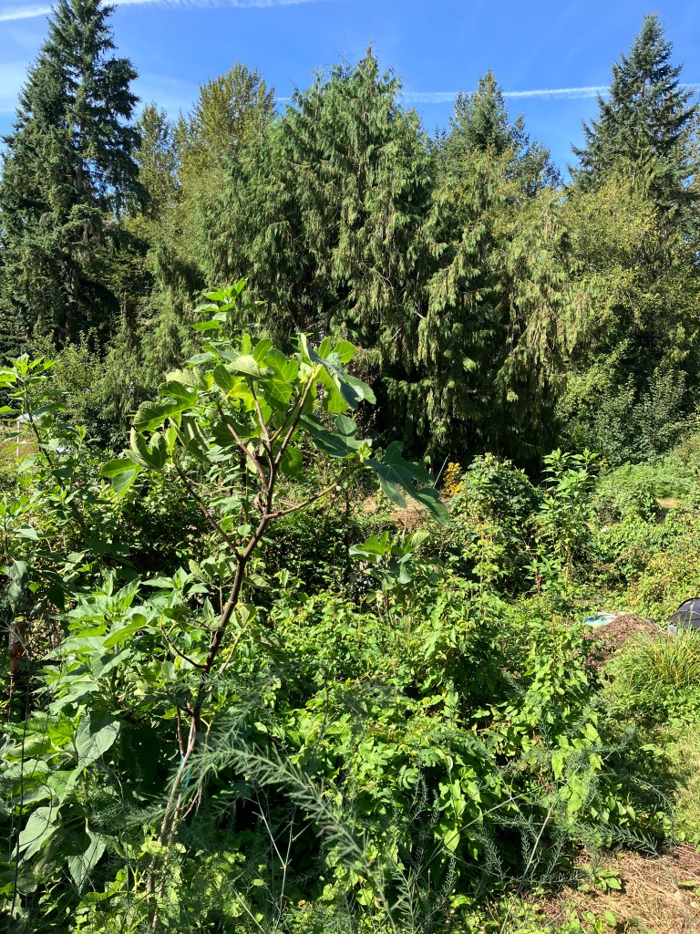 Here in the home garden, there is still a struggle with bindweed, an type of abundance I am not so excited about. The morning glory continues its vie for supremacy, yet with a half day of pulling, I can get ahead enough to let other plants shine. Figs planted last fall are now established and expanding their branches. Sunflowers are about to unfold their discs of sun worship, and native roses, berry bushes, and pollinator shrubs like mock orange, slowly morph from root stock to viable plant on the scene. Future understory champions to fill in the forest recovery effort. There’s a black cap raspberry making a jump to second story level after three years of coaxing into a stable south west corner of the garden. It’s teaming up with a swamp gooseberry to overtake a decorative snowball Viburnum, which is native to Asia. Still, towering above it all in the background is x̌payac, the life tree for tribal peoples of this area, still used for countless articles, from clothing to those water tight boxes to store crabapples. Yes, it took a lot of time and effort to make a box that was air tight and durable for food storage, but what are we doing today? Plastic air tight containers of forever chemicals, which are killing us, and making the future generations sick. I can’t avoid thinking about the microplastics in our food now, even these beautiful fruit trees many of us dreamed of planting in our own orchards, if we were so lucky. Anyway, that does sometimes keep me up at night.