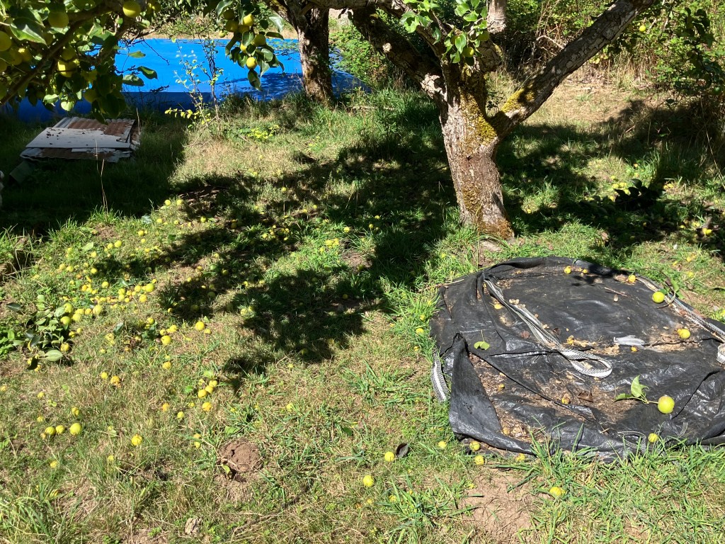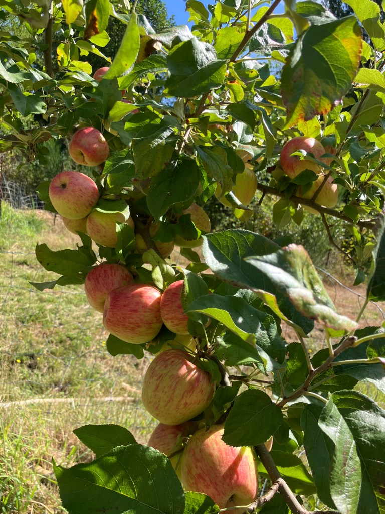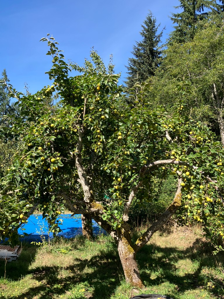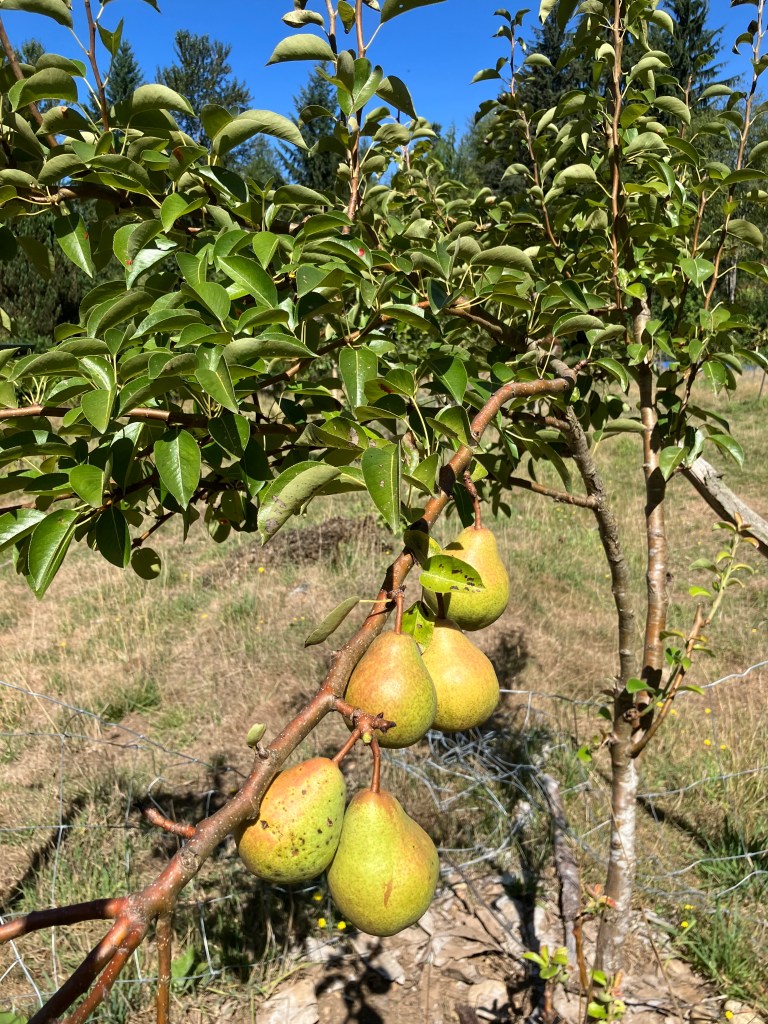 I want to tie back to that bear climbing into fruit trees, and breaking branches. There is something rather smart in the animal’s culling of branches. He naturally prunes the fruit tree. Last summer, a black bear climbed into one of the pear trees and had a feast. he took all the fruit, and took down several of the tree’s branches. As I stand and look at my pear tree this year, at the same time, there is still tons of fruit on the tree, and in fact, it shed a few overburdened branches last week on its own. To help prevent more cracking branches, I’ve done a few shakes of the pear tree to let some of the fruit fall to save branches. I know I can’t eat all the Asian pears on this tree, and the early falling stuff is not ripe, but the sheep will enjoy them, and I’ll get more mature fruit from what’s left- if the bear does not come through again. One thing to point out- I don’t have to do any of this management on my native fruit bearing species- like that crabapple I’ve been going on about, but then again, q̓aʔxʷ would not put out so much soft, fleshy fruit that my culture, and pallet prefer. Gratitude for all the choices in food I get to make here at EEC Forest Stewardship, and all the people who get to share in this modest bounty.