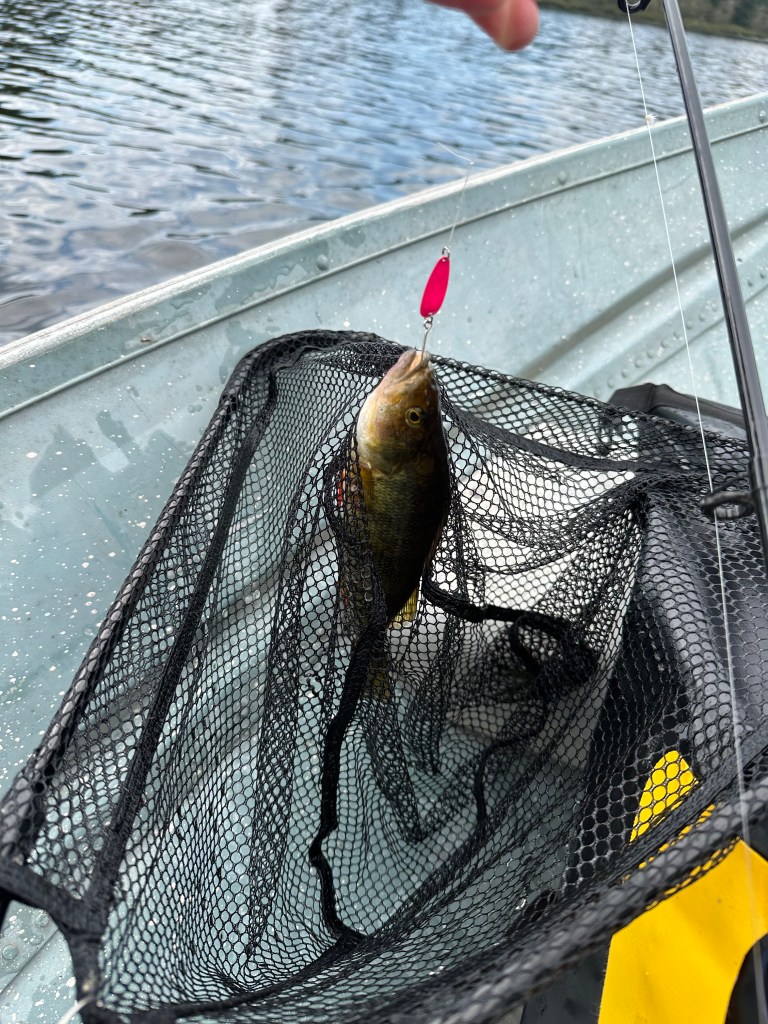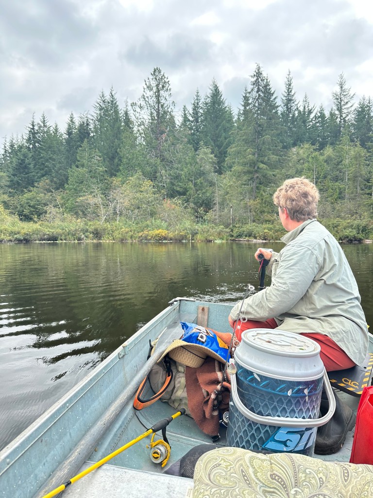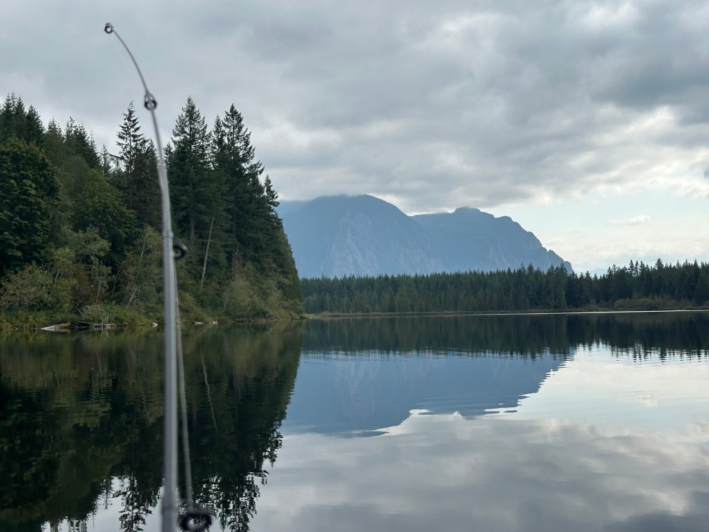 At the end of the summer, a friend joined me in the boat for an afternoon of fishing in Klaus Lake at The Snoqualmie Tree Farm. We both have recreational passes, and enjoy exploring, fishing, and hunting together in the woods here. Since it was late summer, the lake was down a bit, but a boat still fit in at the launch spot, and with a little punting, we floated out into this beautiful water. Earlier this Spring I had fished this lake with my mentor Wes. We caught a few small perch and had planned to come back a few months later in hopes that the little fish had grown into bigger fish. Well, they did.