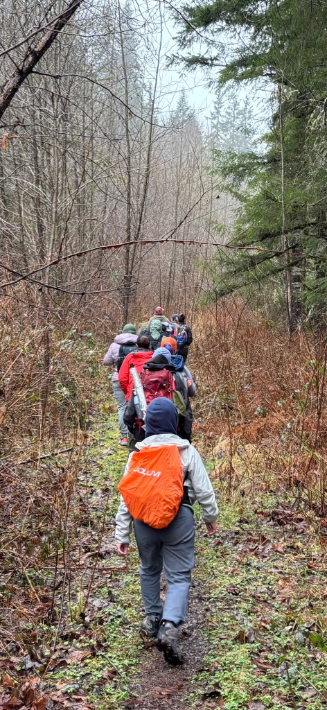 An enthusiastic group of adventurers headed into the wilds, accessible from Mackworth Forest, where Swan Mill Pond Loop, on Tulalip lands, offers a good look at local wetlands, mixed forest ages and stages, and some challenging water crossings that change with the rain forecast. The weather held for our hike, and just the right amount of misty forest magic fell, glistening in the branches and on the mossy rocks along the trail. Late winter seems like a sleeping world outside, and though many plants lay dormant, some Spring buds, flowers, and leafing edges were just starting to emerge. Someone asked about the mosses and what they can be used for. In emergencies, packing a wound, cooling a burn, or as a menstrual pad are some options. Another curious lady pointed out turkey tail mushrooms and we talked about fungal forms and certain family characteristics to look for when identifying. Though many types of fungus and plants we talked about can be used medicinally, it is best to connect with a certified herbalist and your doctor before taking wild medicine.