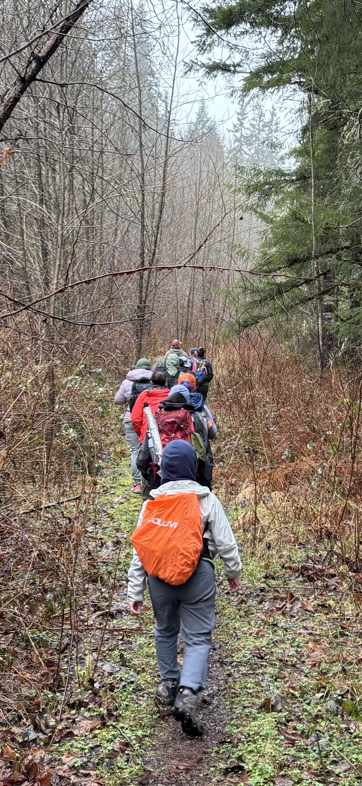 An enthusiastic group of adventurers headed into the wilds, accessible from Mackworth Forest, where Swan Mill Pond Loop, on Tulalip lands, offers a good look at local wetlands, mixed forest ages and stages, and some challenging water crossings that change with the rain forecast. The weather held for our hike, and just the right amount of misty forest magic fell, glistening in the branches and on the mossy rocks along the trail. Late winter seems like a sleeping world outside, and though many plants lay dormant, some Spring buds, flowers, and leafing edges were just starting to emerge. Someone asked about the mosses and what they can be used for. In emergencies, packing a wound, cooling a burn, or as a menstrual pad are some options. Another curious lady pointed out turkey tail mushrooms and we talked about fungal forms and certain family characteristics to look for when identifying. Though many types of fungus and plants we talked about can be used medicinally, it is best to connect with a certified herbalist and your doctor before taking wild medicine.