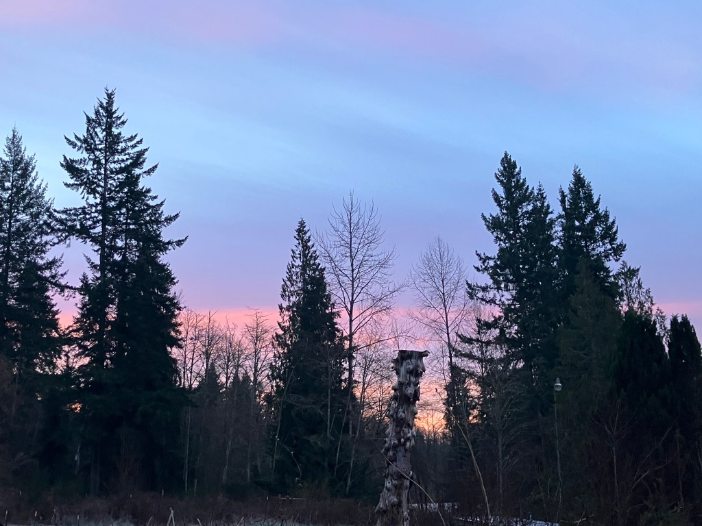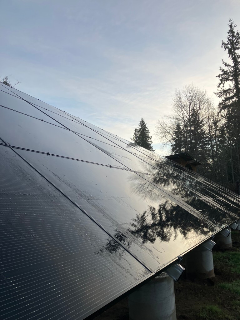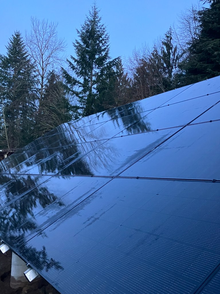 Crossing the driveway to the east, I enjoyed witnessing first light striking across the landscape, opening shape to the world, and subtle color, ash grey, ice blue, and solid shadow black. A looming new silhouette breaches the skyline, an imposing form with damp sheen reflects earth and sky. The new solar array will be harvesting a lot of kWh today. January 2026 brought in 1,002.6 kWh. I earn about 10 kWh on a cloudy day, so even when the sun is behind the clouds, power still comes in. It’s a great long term investment for the energy needs of house and farm. Taking time to look at this new instillation, I am lost in the abstract reflections on water and glass, reflecting forest and predawn light. It’s a lot of imported material, but it will spend the rest of my lifetime capturing energy from a totally green source to keep this place affordable and regenerative.
