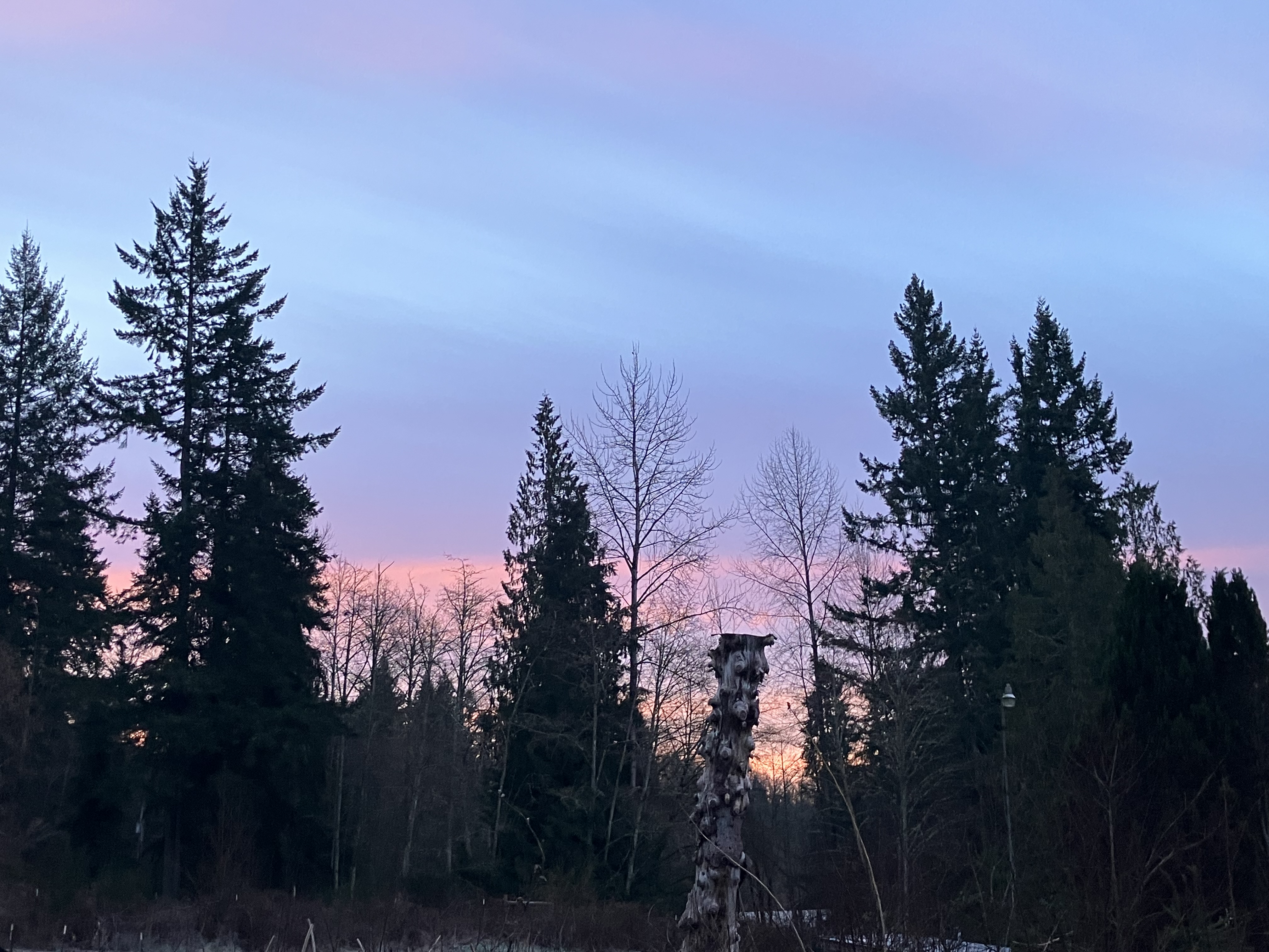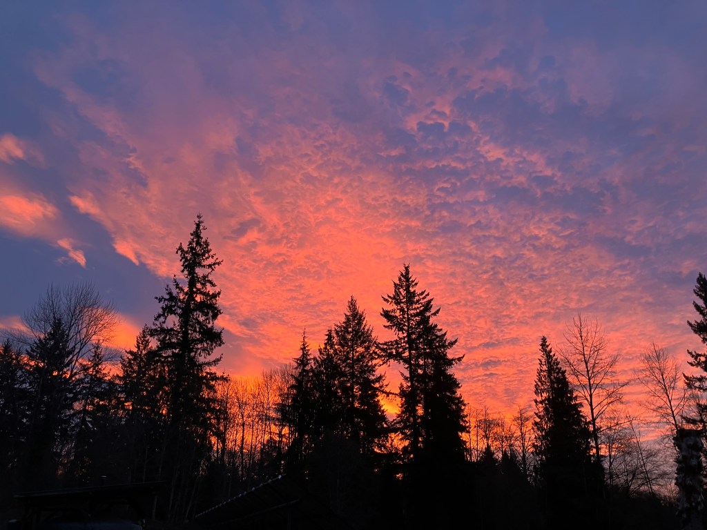 There are sometimes very dramatic sunrises in winter here. So much color in the space where bare branches allow the morning glow to burst through between silhouetted evergreen giants. A ripple of cirrostratus clouds stretch from the horizon, reflecting saturated warm tones. Even through the air temperatures hovers at freezing, seeing this morning glow rising from the east signals warmth to come in an ever lengthening day. Bulbs are pushing up strong green shoots, with more cold weather on the way, I try to cover the enthusiastic new growth with mulch for protection, which I will have to remove once Spring arrives to prevent my bulbs rotting in soaking wet ground. Mulching and trimming back are two ever present chores of this landscape. Sometimes the livestock can help, but in the more sensitive plantings, it’s all by hand. Quiet meditation while pruning back bramble and new fruit tree suckers becomes rhythmic motion throughout the daylight cycle. As sheep graze across the pasture, my shears take young wood and budding cane back to manageable shape and productive spacing. As the light sharpens, I can see the outcome of these simple repetitive labors. Healthy branches shaped to hold fruit and retain airflow. Mildew can rot young fruit, and greater dampness leads to debarking, and the loss of the branch over time. Fruit trees can be high maintenance, but once you find out which verities work well in your microclimate, you’ll have set an orchard. If you have enough light.