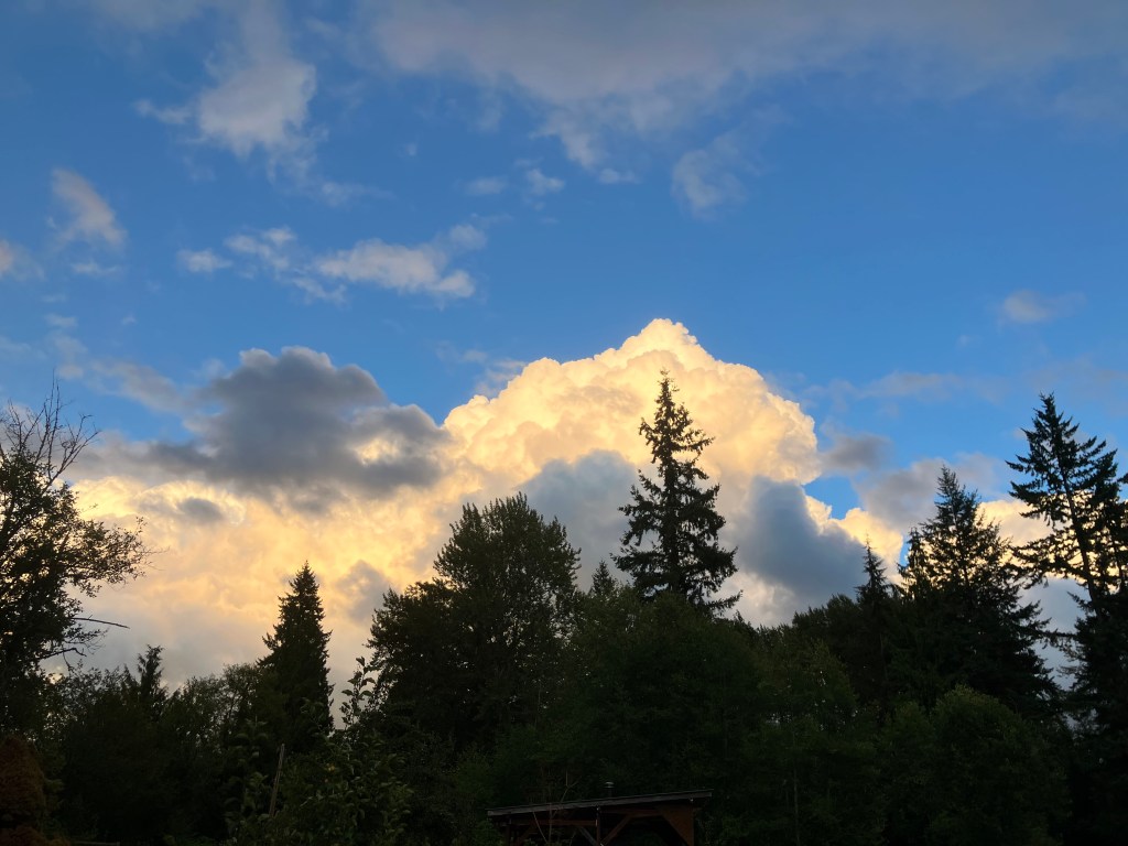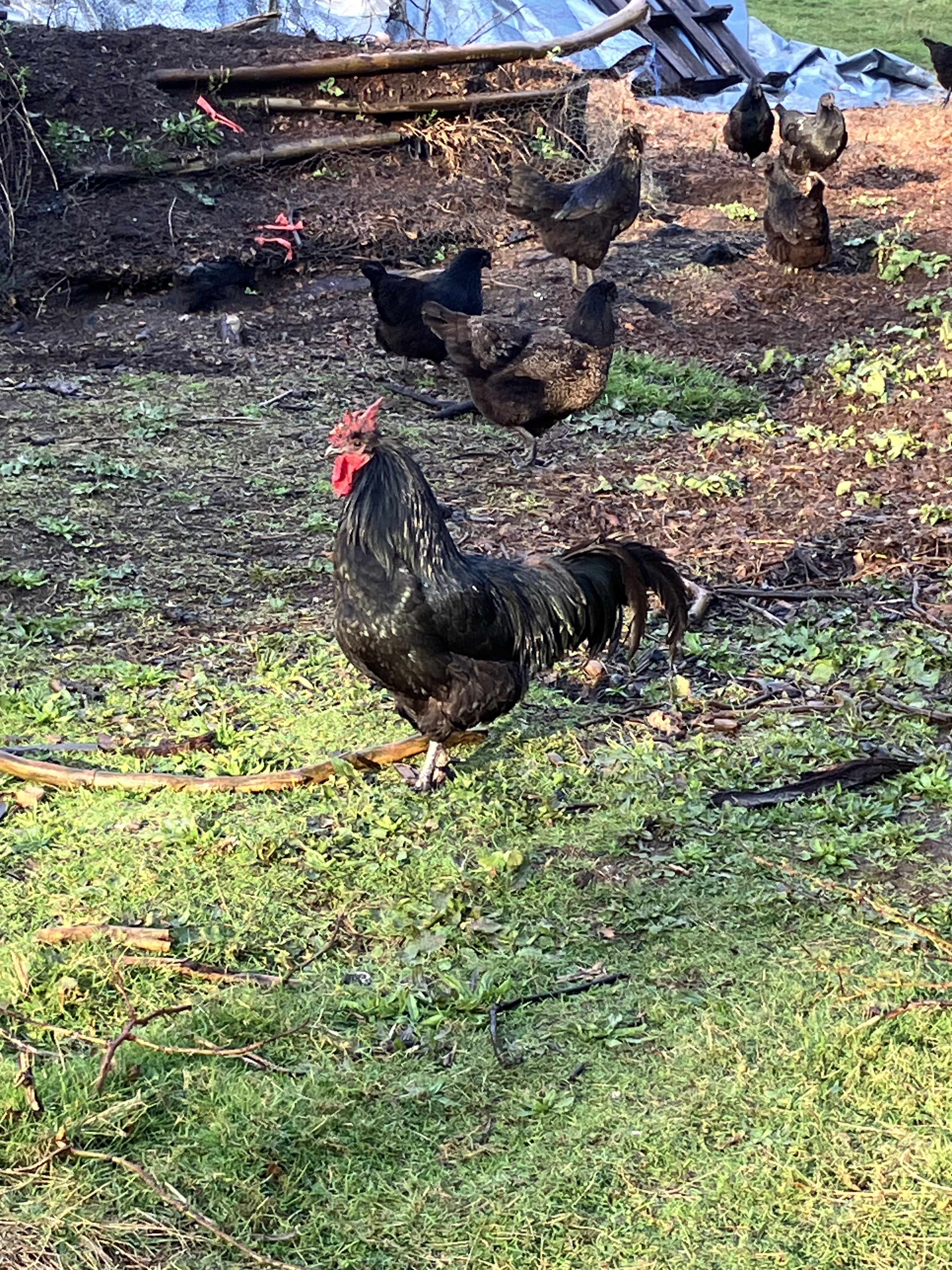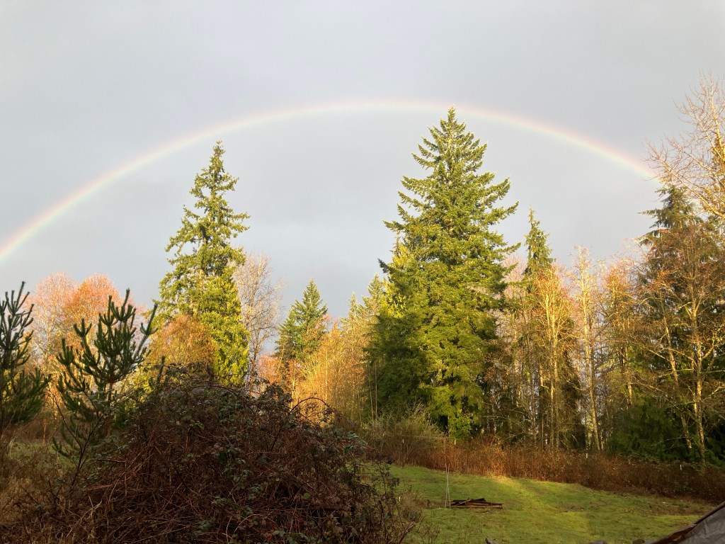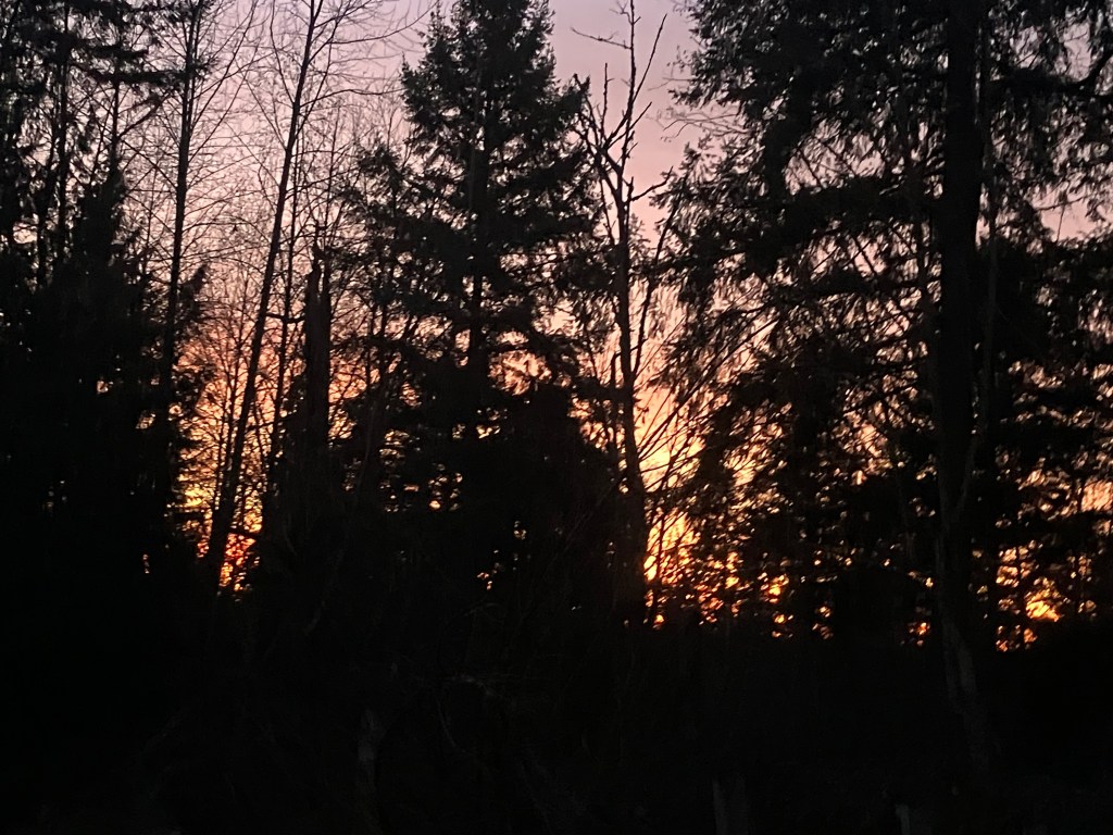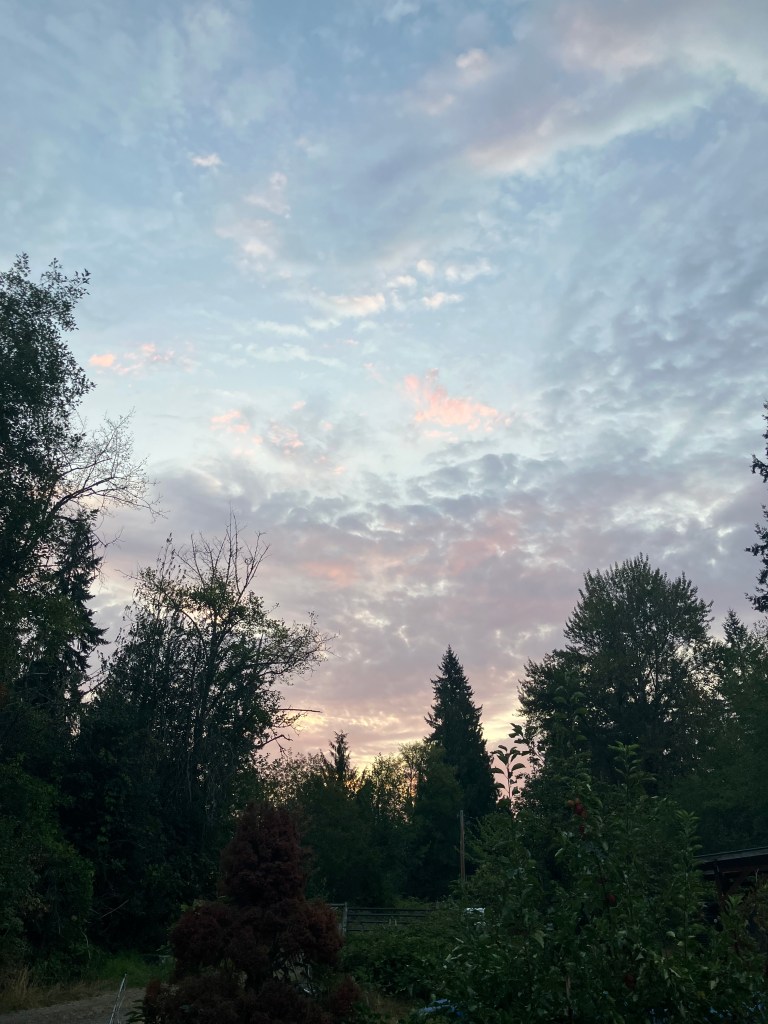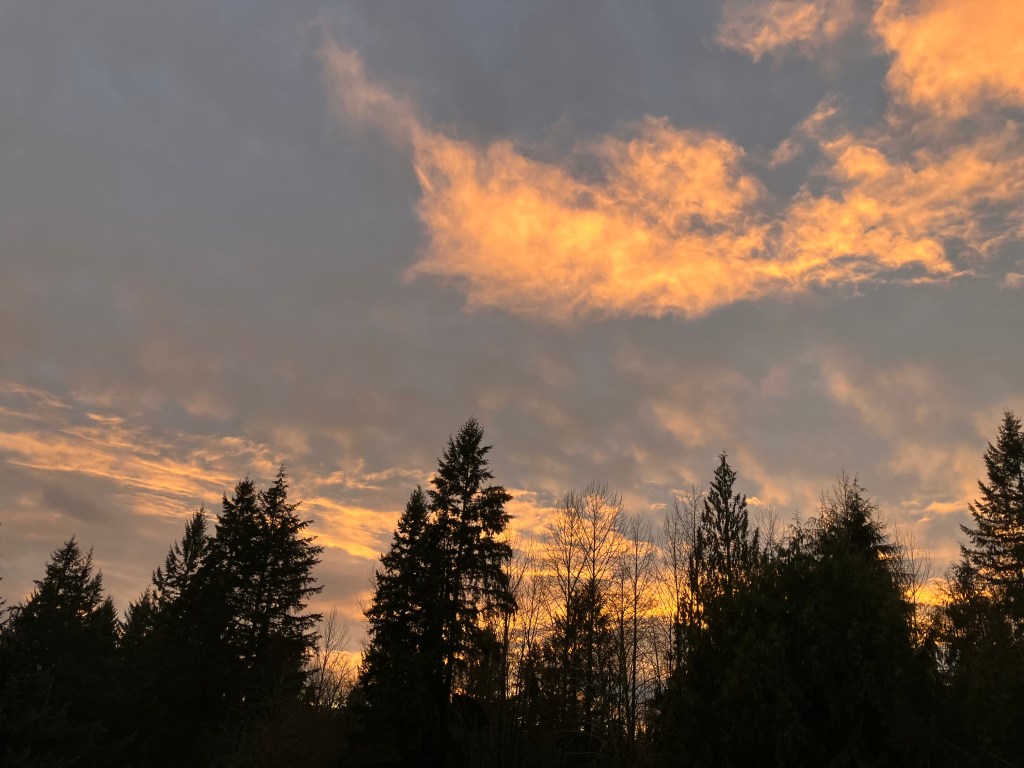 The brilliant south facing gentle slope of this property invites beautiful sun catchment in the upper most elevations, where the house and main orchards and gardens lay. This aspect invites both the open view of sky and all the shapes and colors of clouds forms drifting across it. There are days of slate gray sky, but usually, dawn and dusk have a lot of light contrasts to offer. I’ve caught a few of these magical times, like this morning, and in the evening, when the sun dips below the cloud line in the west, the light often showers the sky with orange, pink, lavender, fuchsia, and deep purples, reflections on the bright ocean waters off our coast in The Pacific. The hues are spectacular, and what some in the area call Seattle’s “5 O’clock cocktail hour”. I will say, my chickens do look good in late evening light.