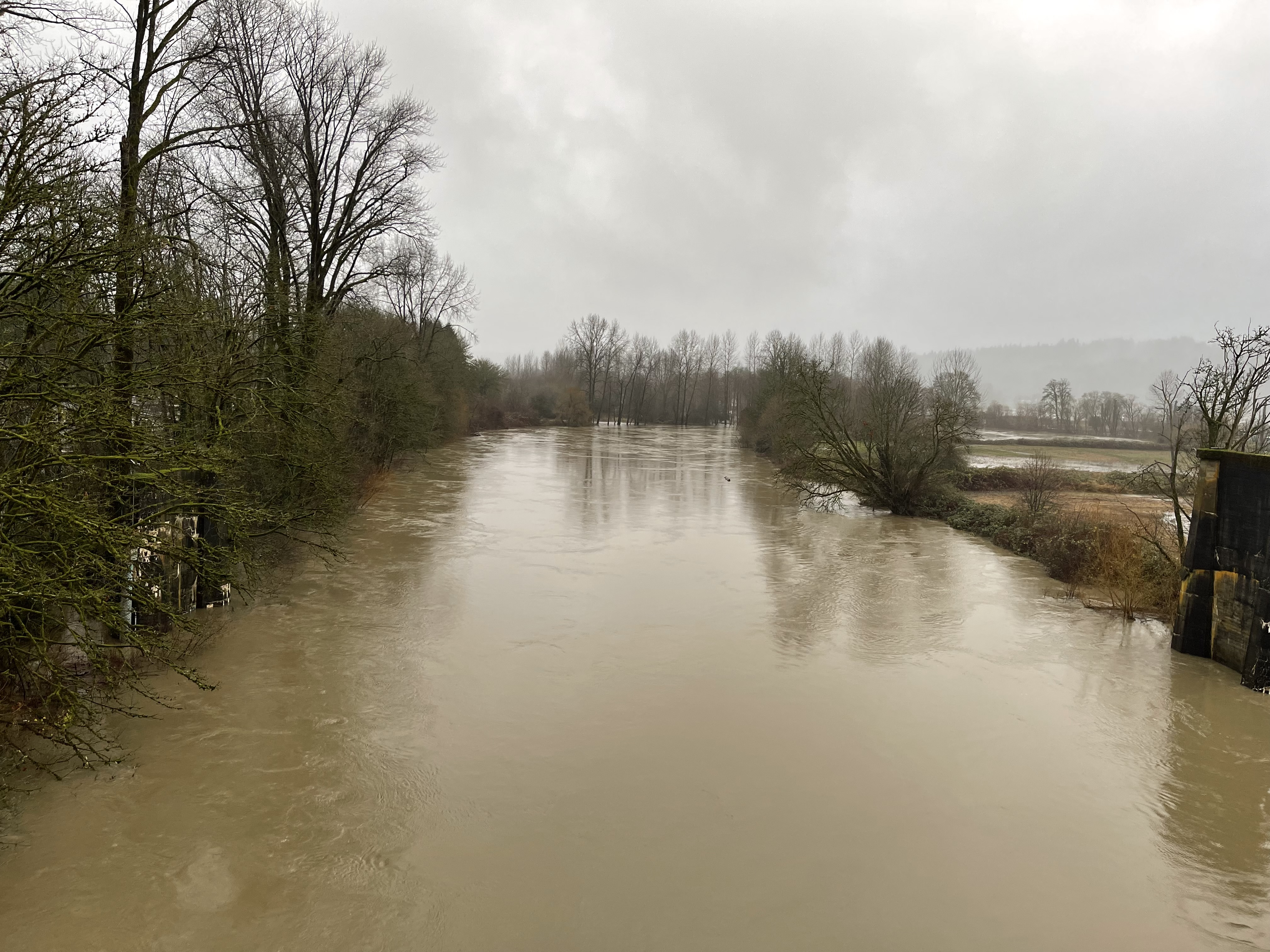 It was not a surprise folks- and we’ll be an island for at least tonight and most of tomorrow, then a break before another round of rain will potentially raise the rivers again- hopefully not as catastrophically as today, but flooding will continue throughout the winter, along with landslides. That’s what happens when it rains a lot around here. Since today was indeed a special day of extremely high flood waters, I did take a few hours to explore and document the water works in the valley. Lots of other folks had turned out- school was canceled, and a lot of folks could not drive into work this morning because of the flooded roads. Duvall is an island right now- in the sense that no public roads are open due to flooding. But it was a great day to get out on foot to see the water level rising and celebrate this some what rare event for the town.